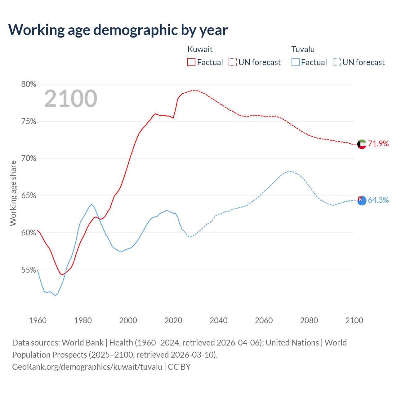 - Kuwait has 4.01M working age adults (aged 15-64) vs 5.64K in Tuvalu.