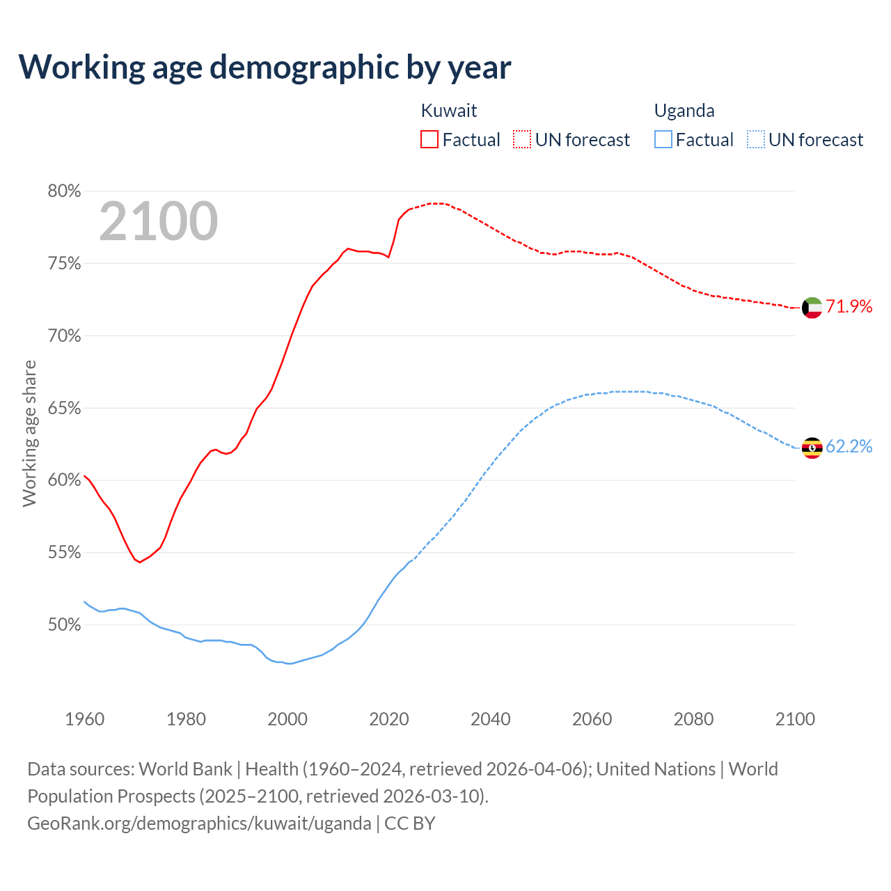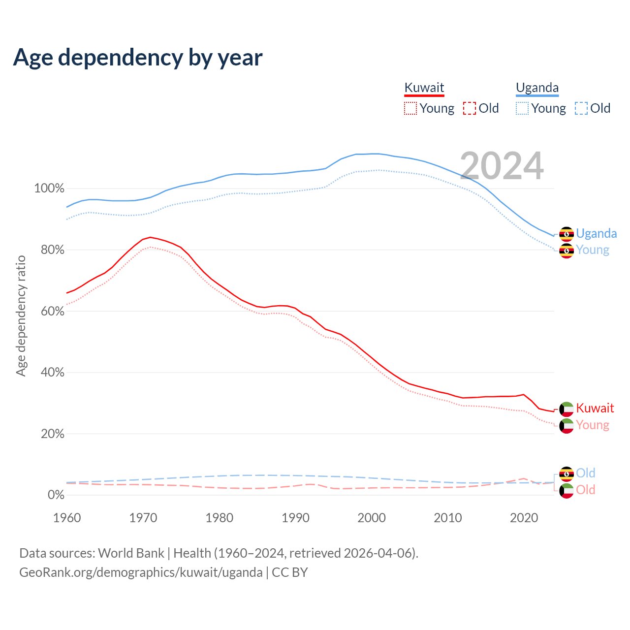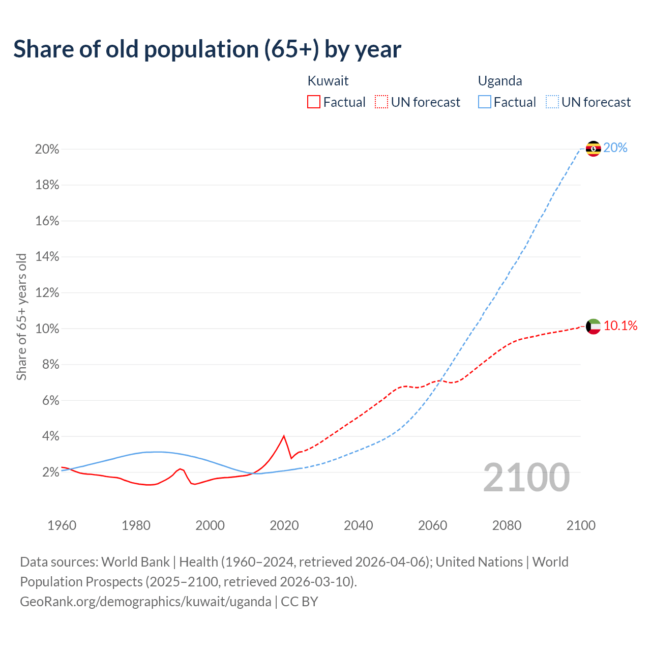 The share of older people aged 65 and over is 3.1% in Kuwait and 2.19% in Uganda. Life expectancy in Kuwait compared to Uganda .