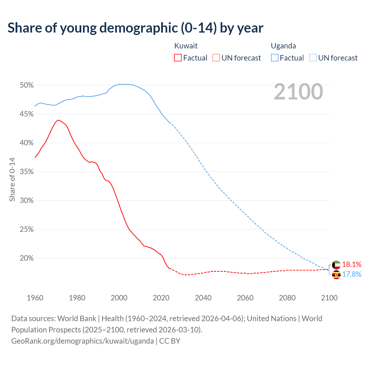 Median age Kuwait vs Uganda, 1960-2100