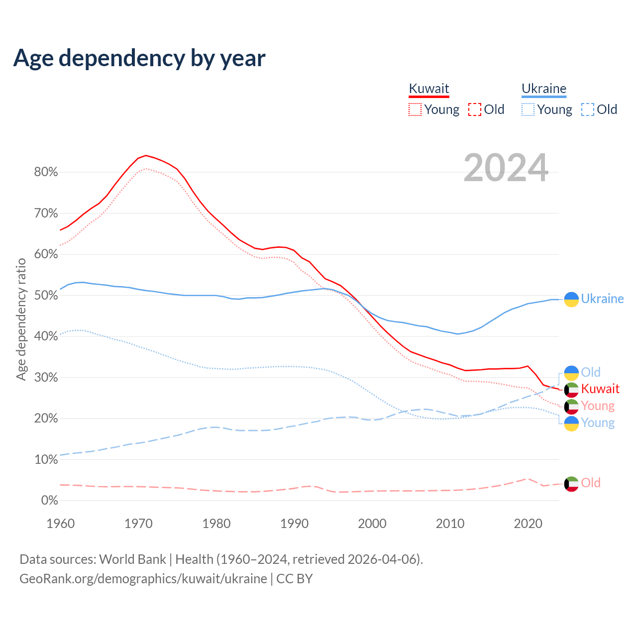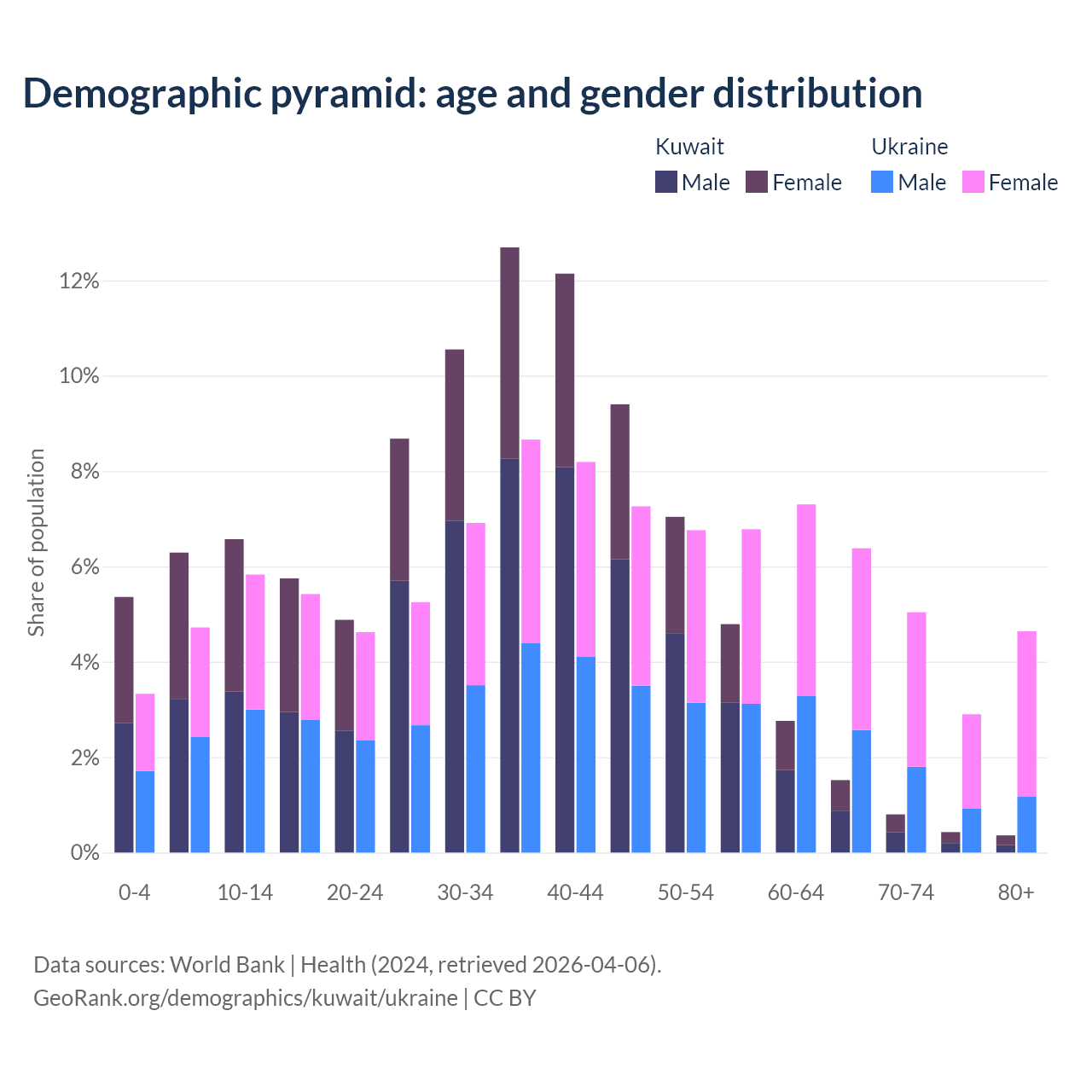 - Kuwait is ranked 71/196 by median age (oldest to youngest) vs 26/196 for Ukraine.