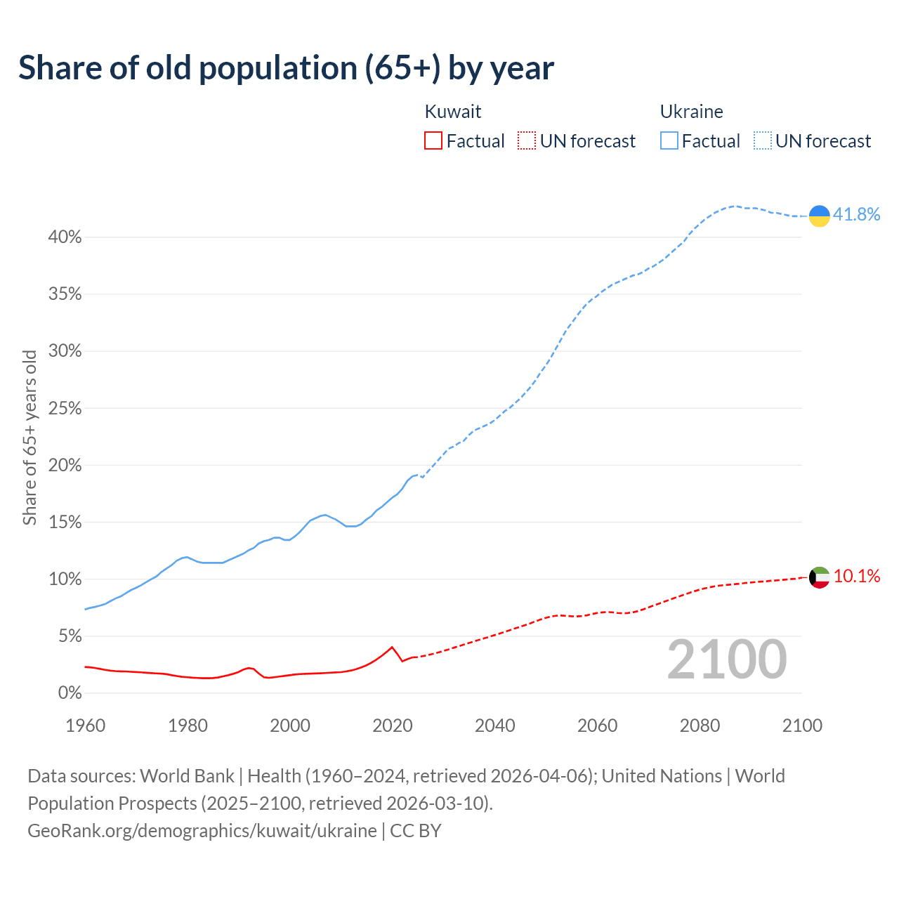 The share of older people aged 65 and over is 3.1% in Kuwait and 19% in Ukraine. Life expectancy in Kuwait compared to Ukraine .