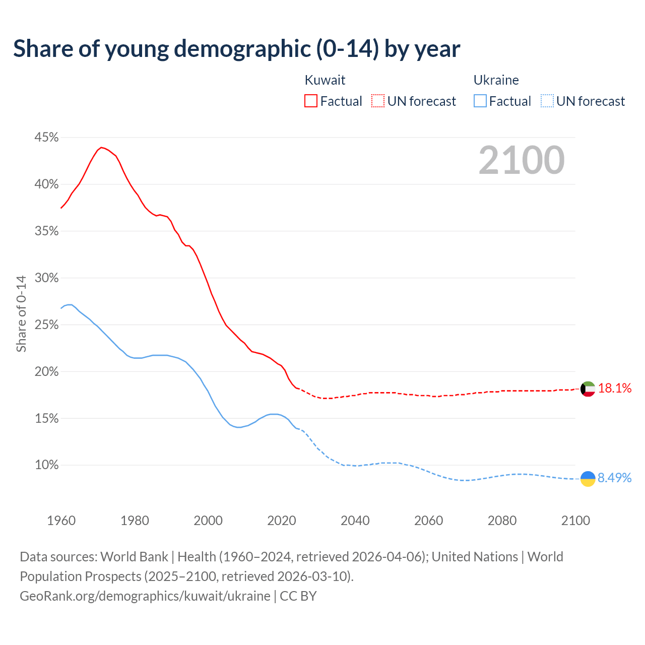 - The share of young demographic (0-15 years old) in Kuwait is 18.2% vs 13.9% in Ukraine.