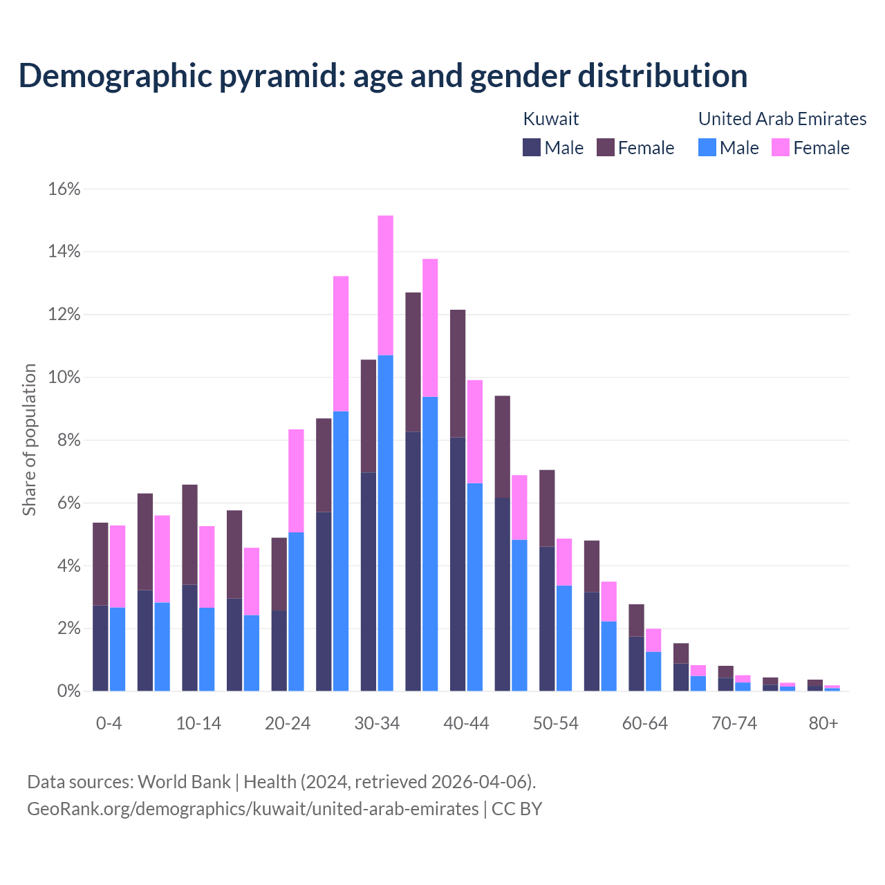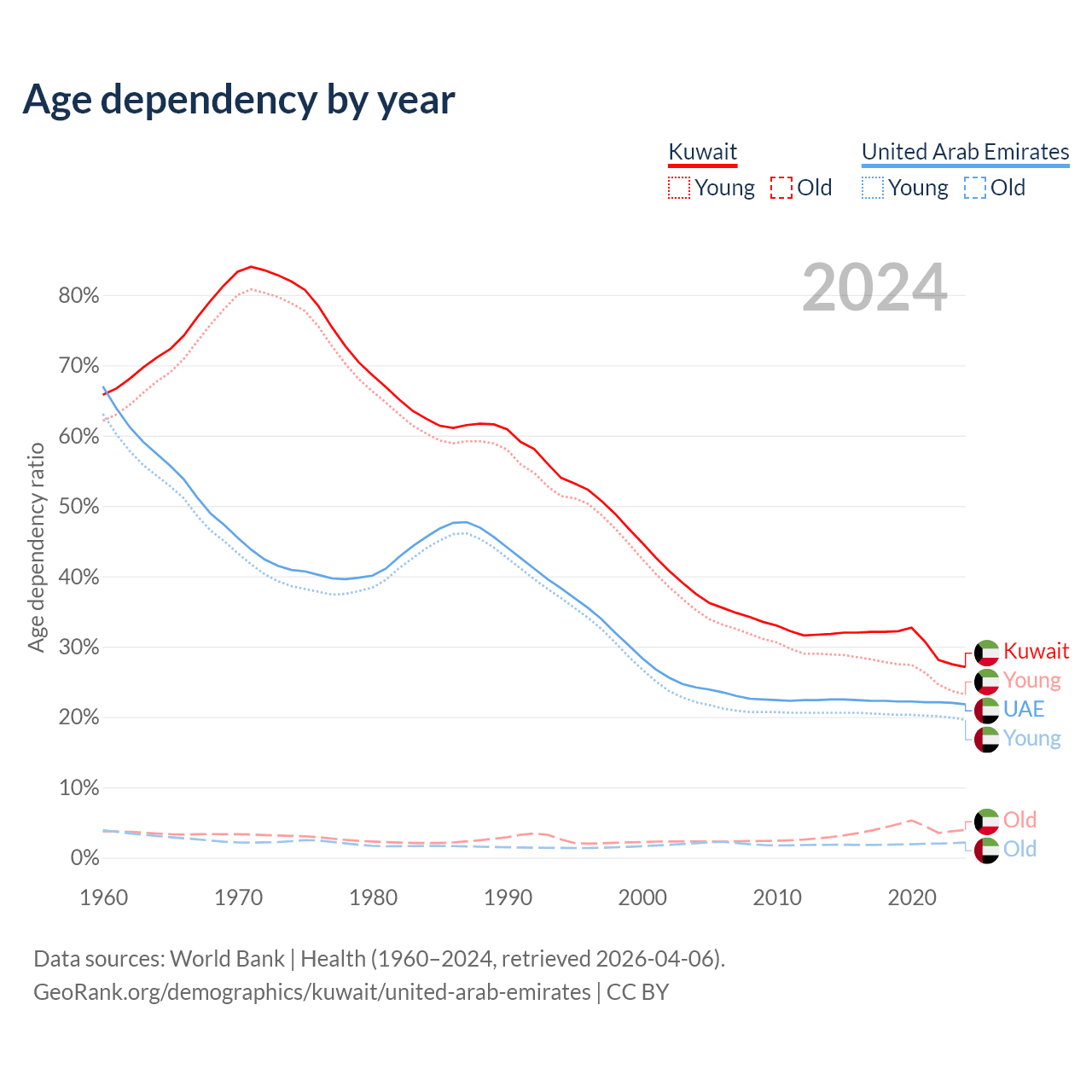 - Kuwait is ranked 71/196 by median age (oldest to youngest) vs 91/196 for the United Arab Emirates.