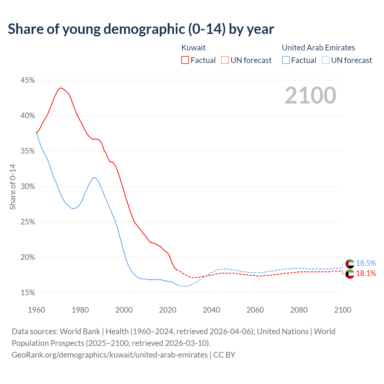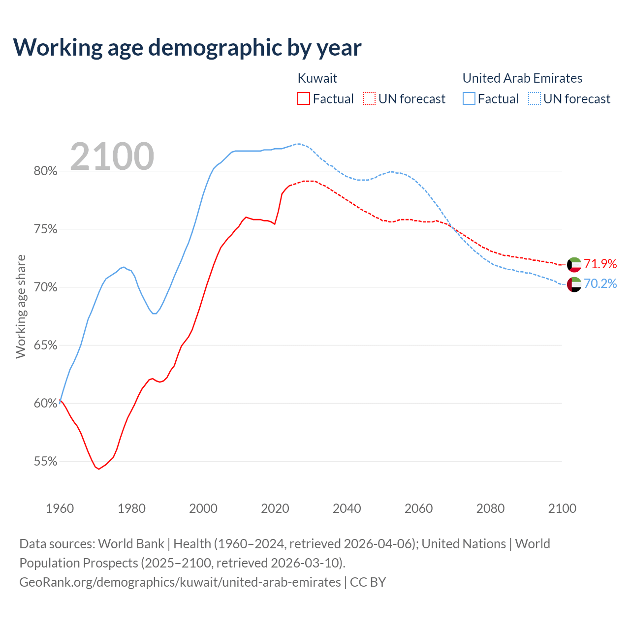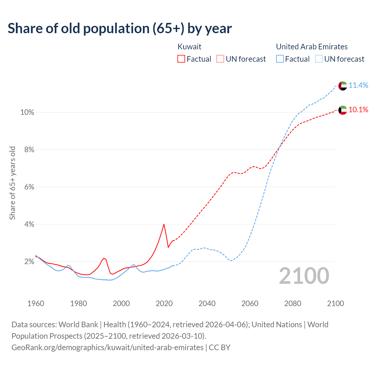 The share of older people aged 65 and over is 3.1% in Kuwait and 1.77% in the United Arab Emirates. Life expectancy in Kuwait compared to the United Arab Emirates .