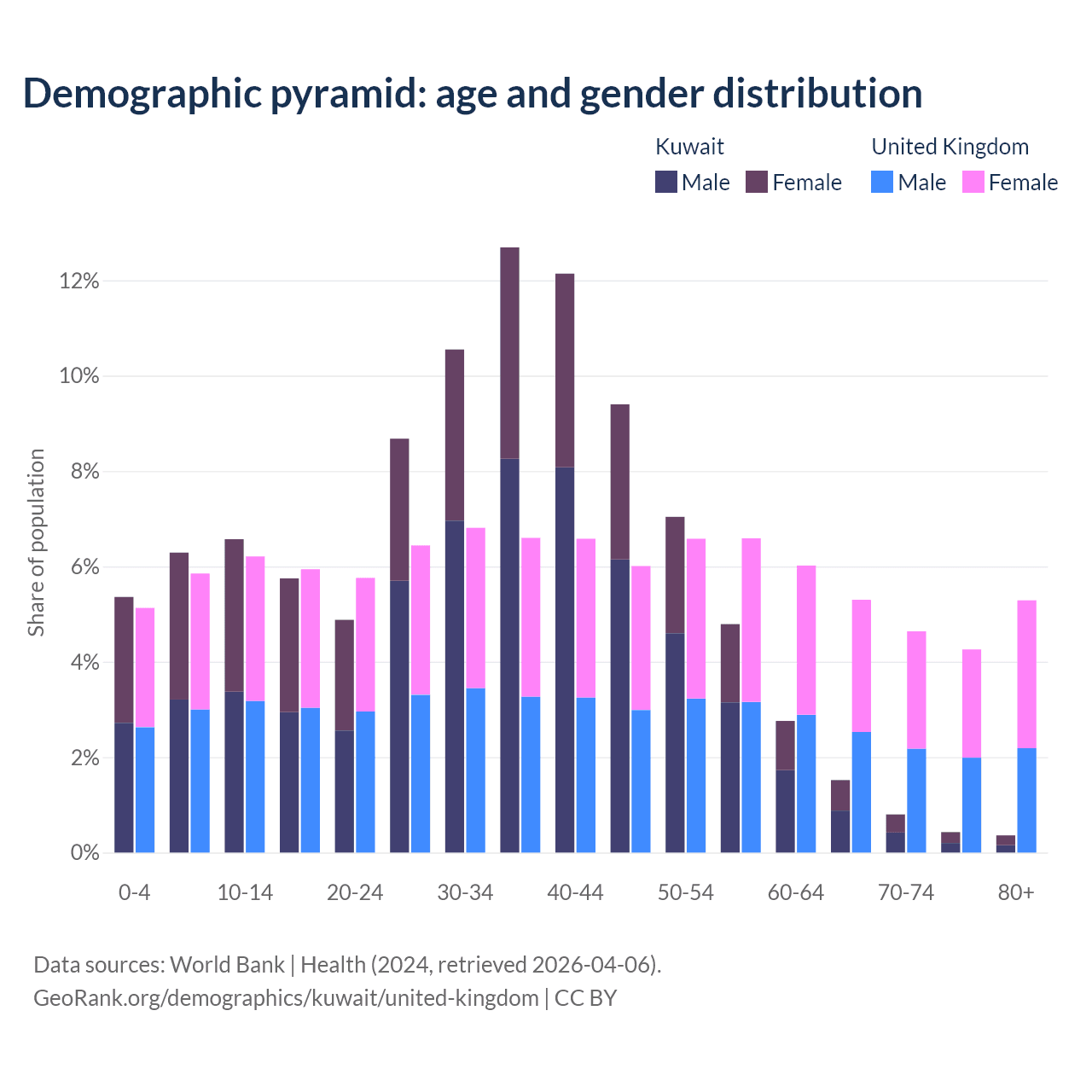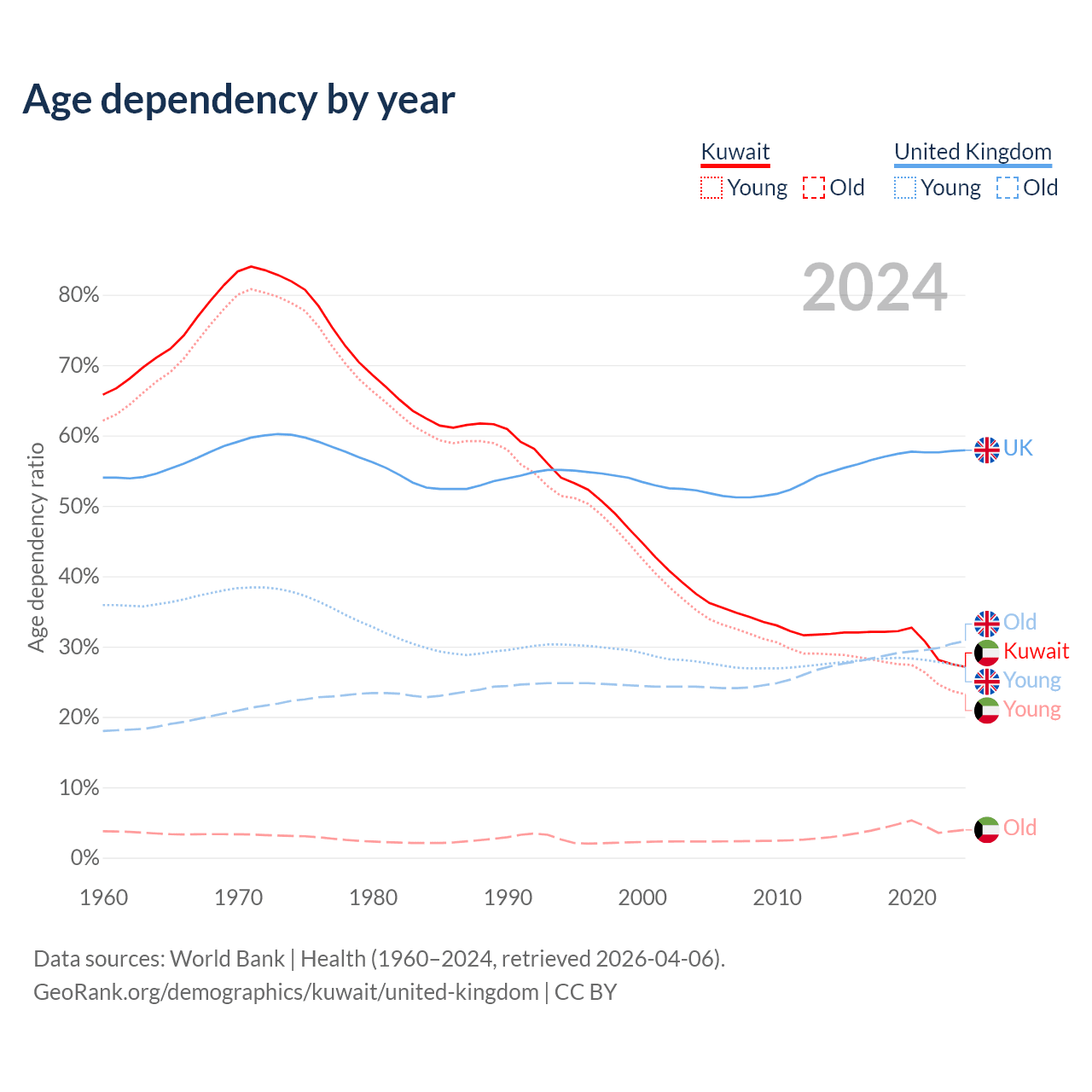 - Kuwait is ranked 71/196 by median age (oldest to youngest) vs 41/196 for the United Kingdom.