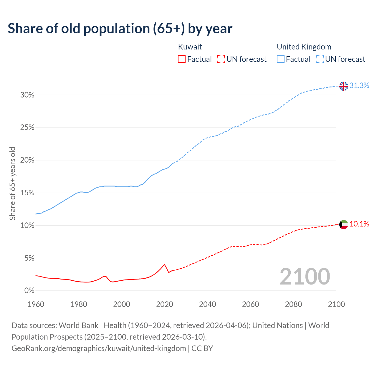 The share of older people aged 65 and over is 3.1% in Kuwait and 19.5% in the United Kingdom. Life expectancy in Kuwait compared to the United Kingdom .