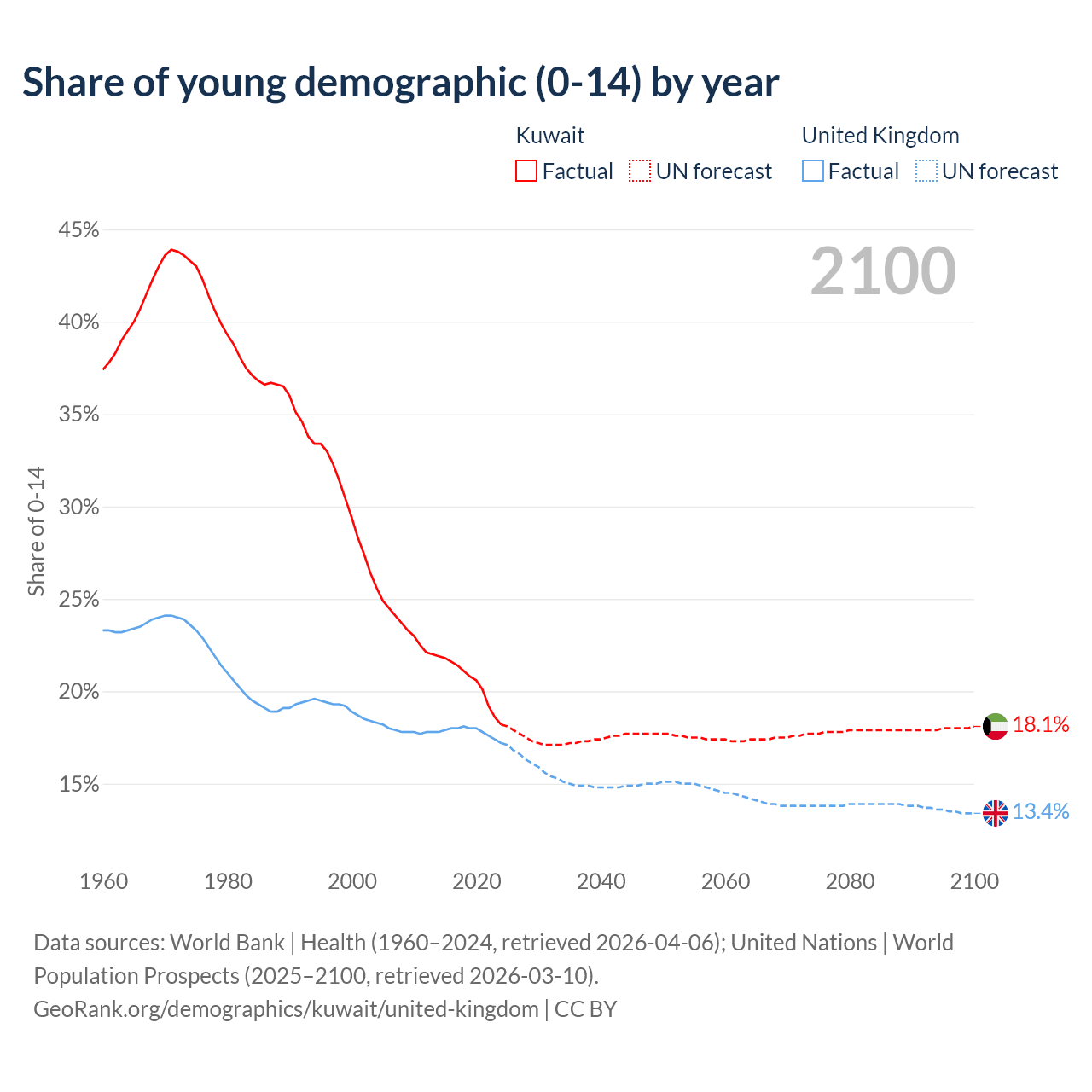 - The share of young demographic (0-15 years old) in Kuwait is 18.2% vs 17.2% in the United Kingdom.