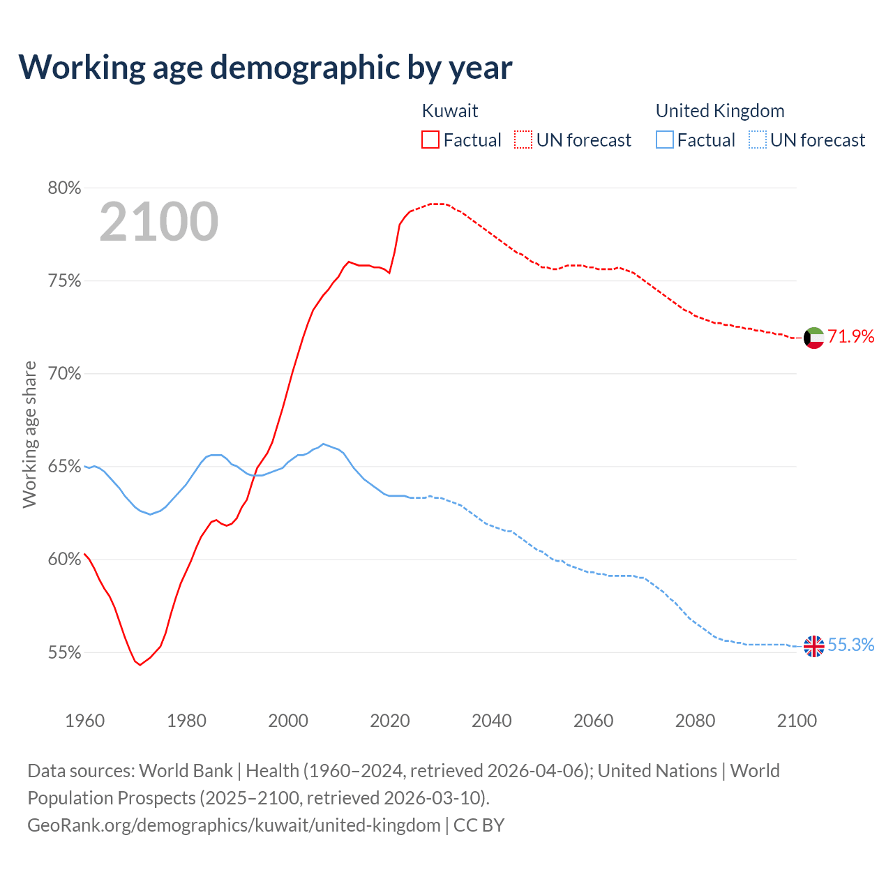 - Kuwait has 4.01M working age adults (aged 15-64) vs 44.4M in the United Kingdom.