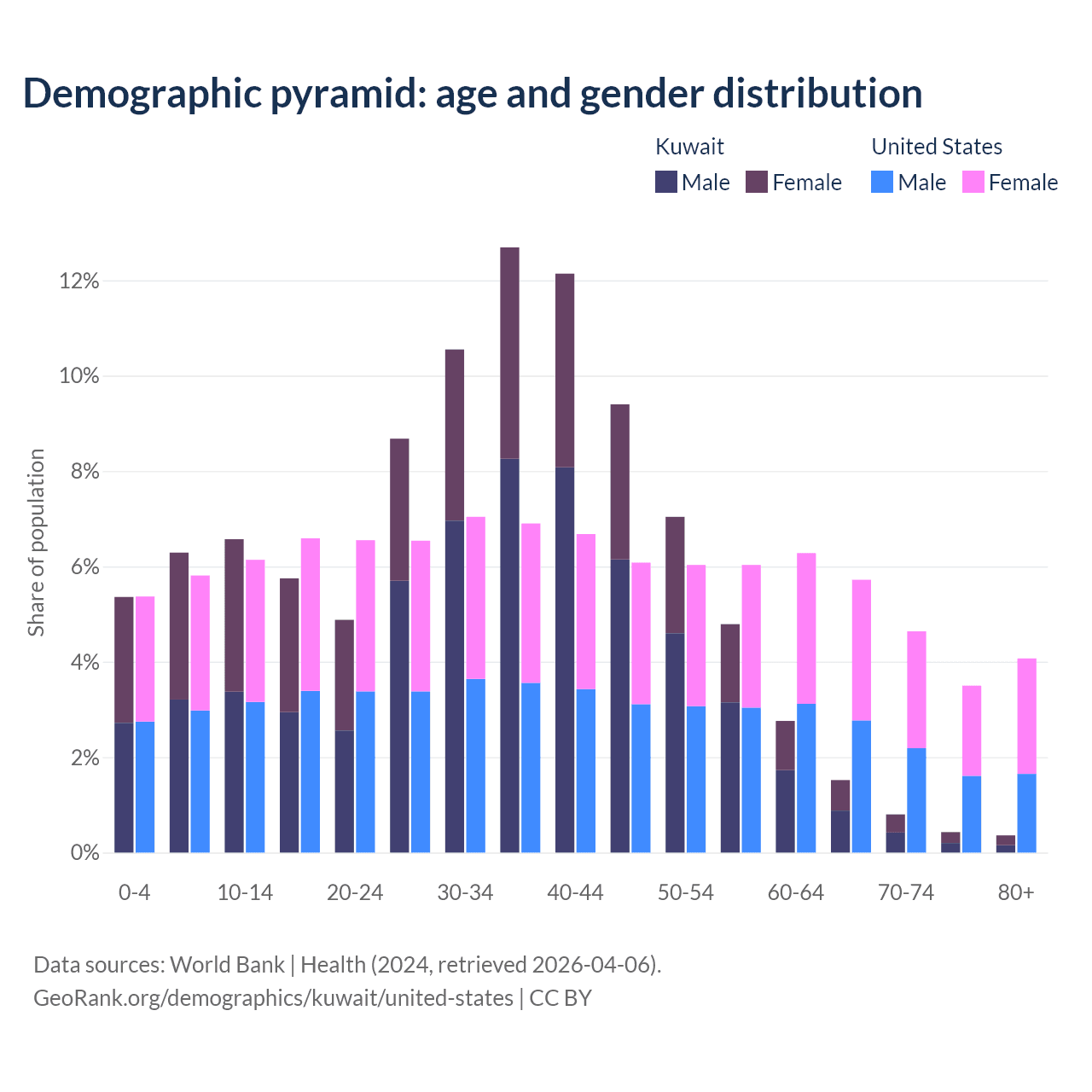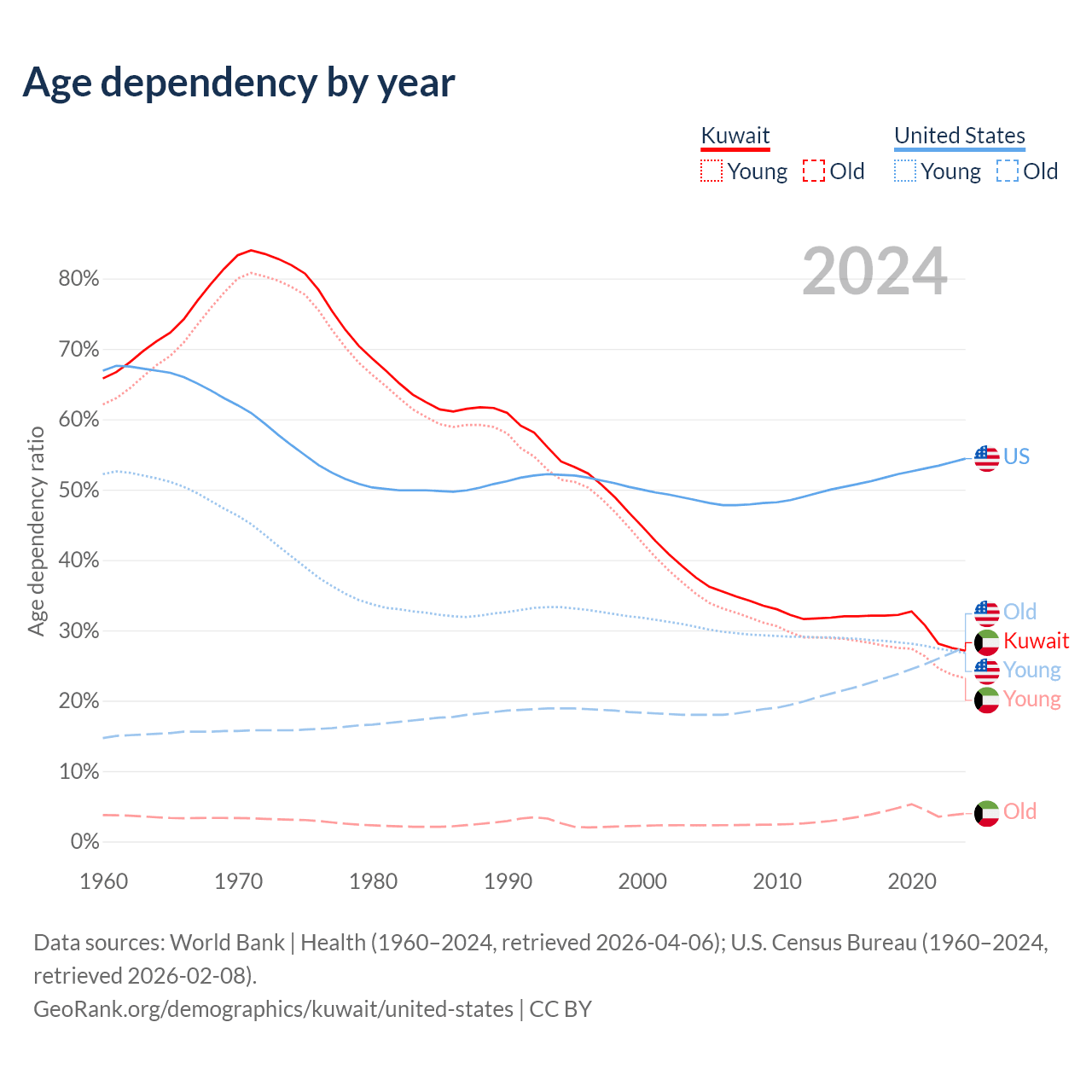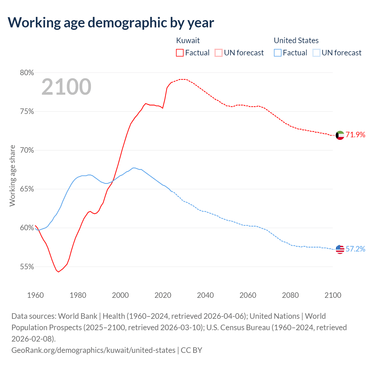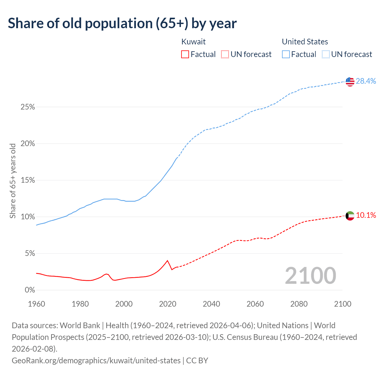 The share of older people aged 65 and over is 3.1% in Kuwait and 17.9% in the United States. Life expectancy in Kuwait compared to the United States .