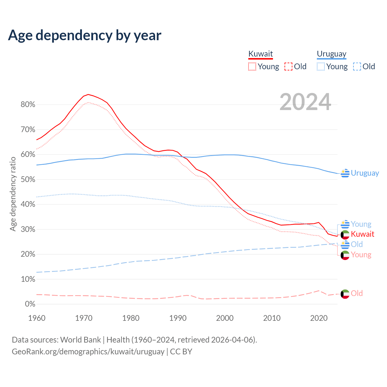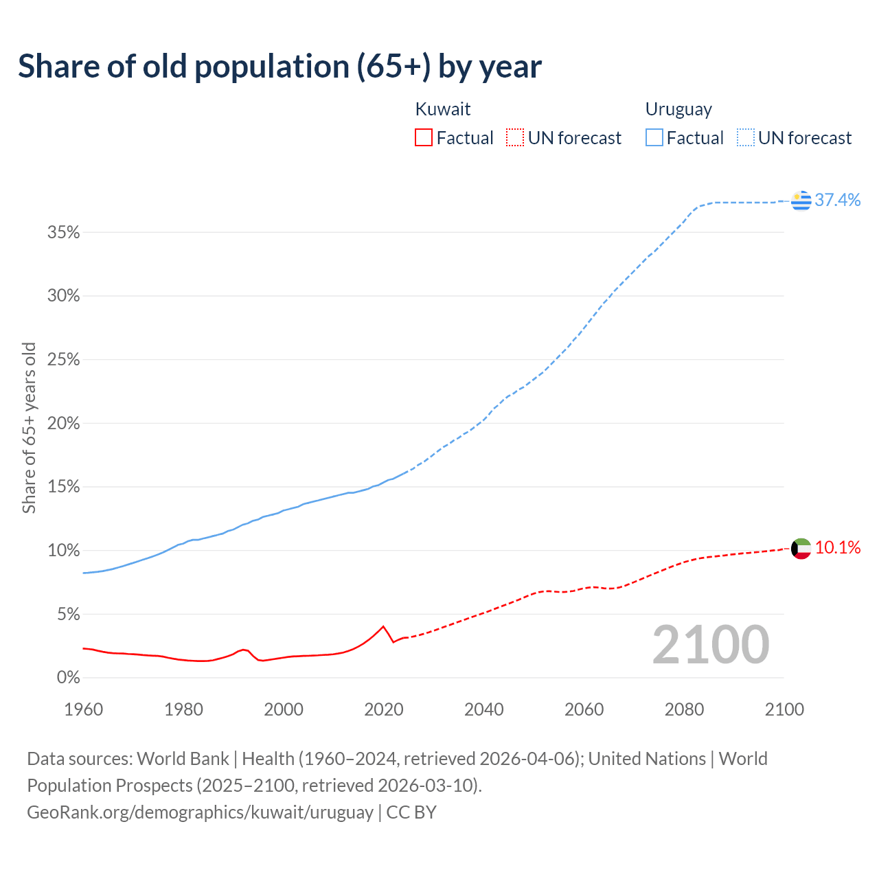 The share of older people aged 65 and over is 3.1% in Kuwait and 16% in Uruguay. Life expectancy in Kuwait compared to Uruguay .