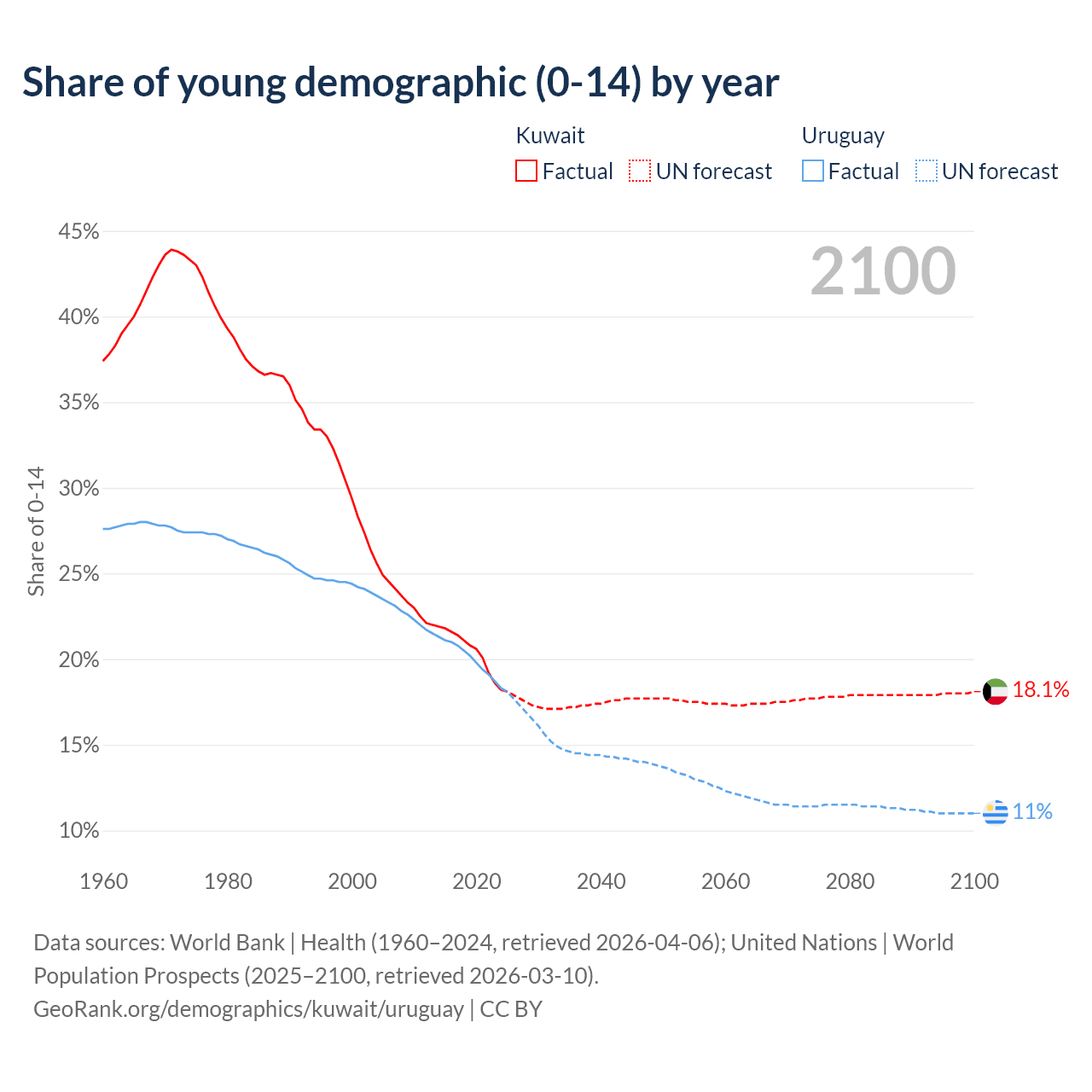 - The share of young demographic (0-15 years old) in Kuwait is 18.2% vs 18.3% in Uruguay.
