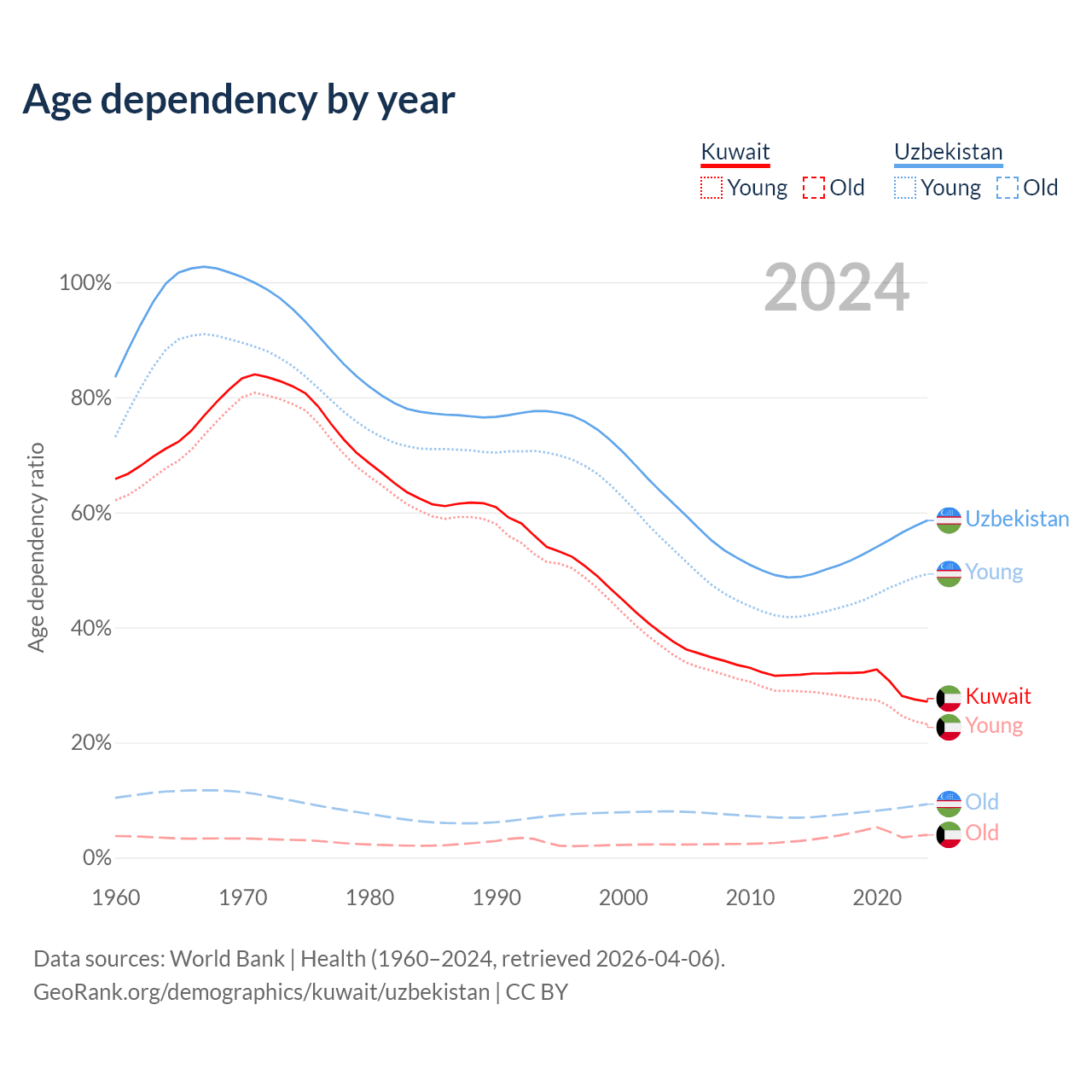 Data sources: World Bank | Health (1960–2024, retrieved 2026-04-06); U.S. Census Bureau (1960–2024, retrieved 2026-02-08).