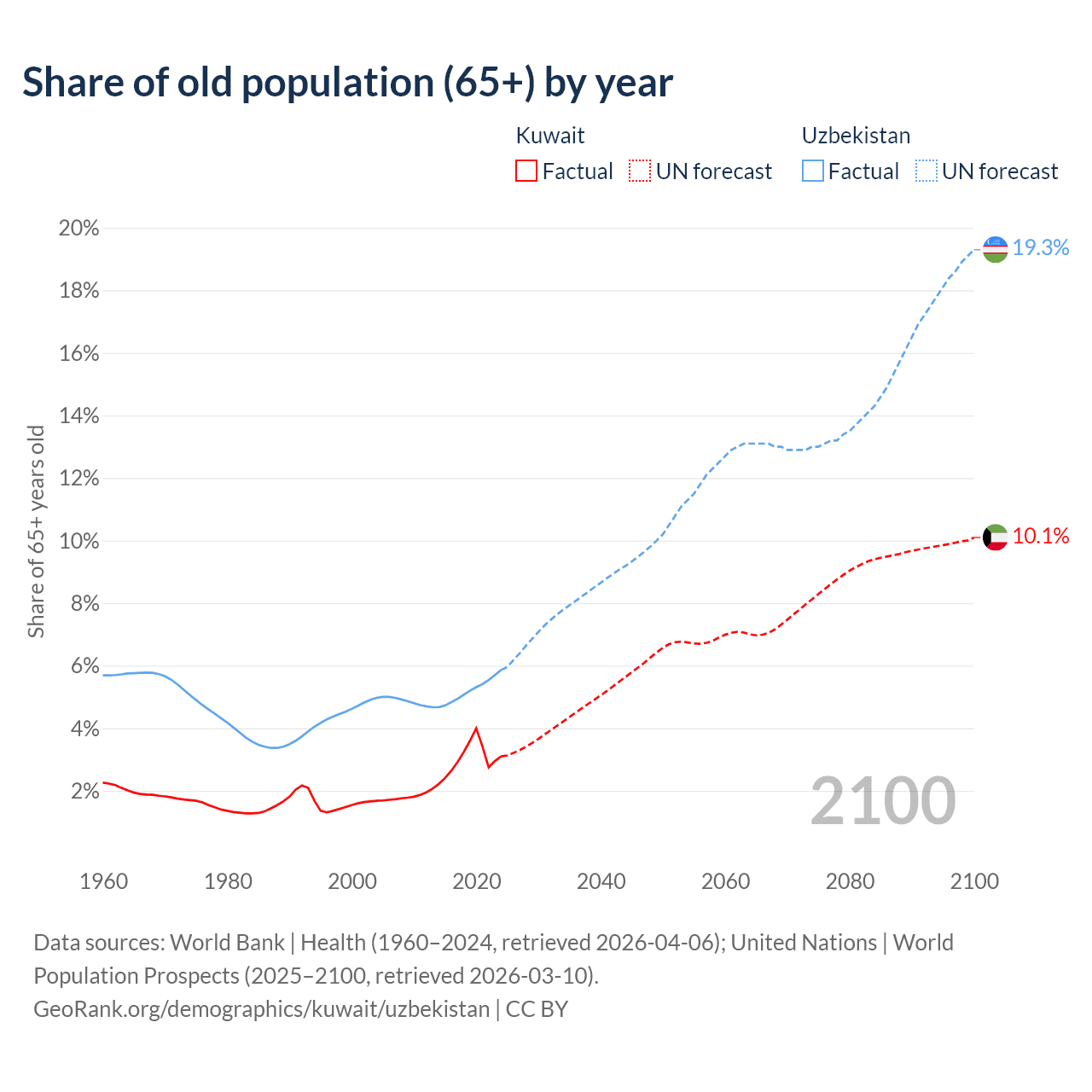 The share of older people aged 65 and over is 3.1% in Kuwait and 5.86% in Uzbekistan. Life expectancy in Kuwait compared to Uzbekistan .