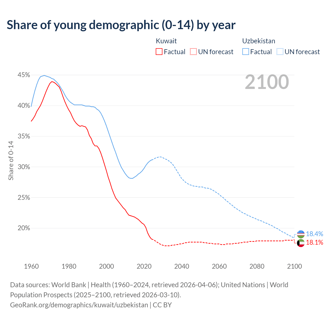 Median age Kuwait vs Uzbekistan, 1960-2100