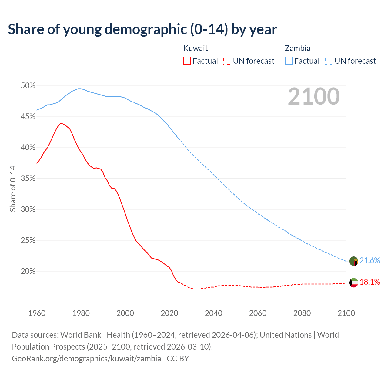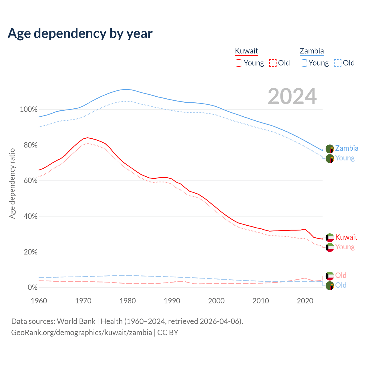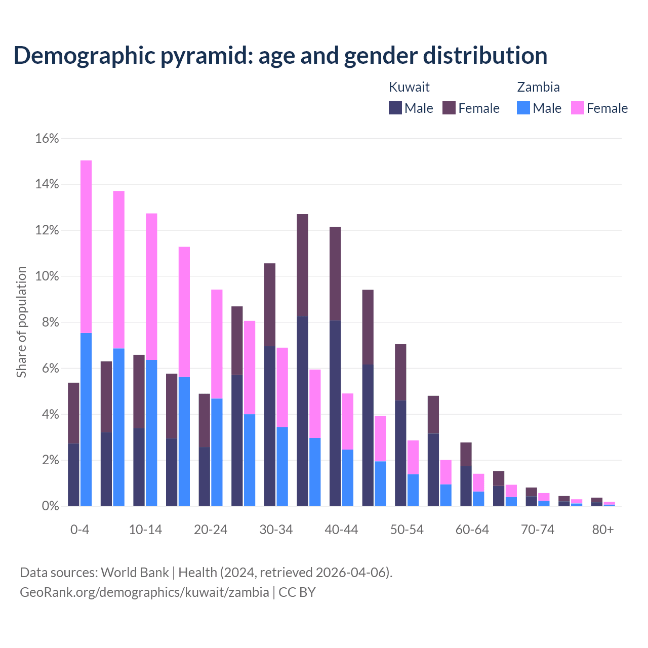 - Kuwait is ranked 71/196 by median age (oldest to youngest) vs 182/196 for Zambia.