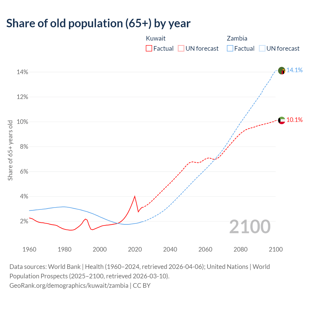 The share of older people aged 65 and over is 3.1% in Kuwait and 1.95% in Zambia. Life expectancy in Kuwait compared to Zambia .