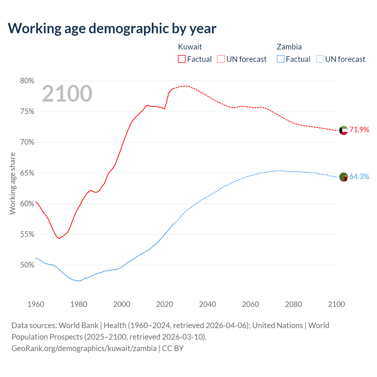 - Kuwait has 4.01M working age adults (aged 15-64) vs 12.8M in Zambia.
