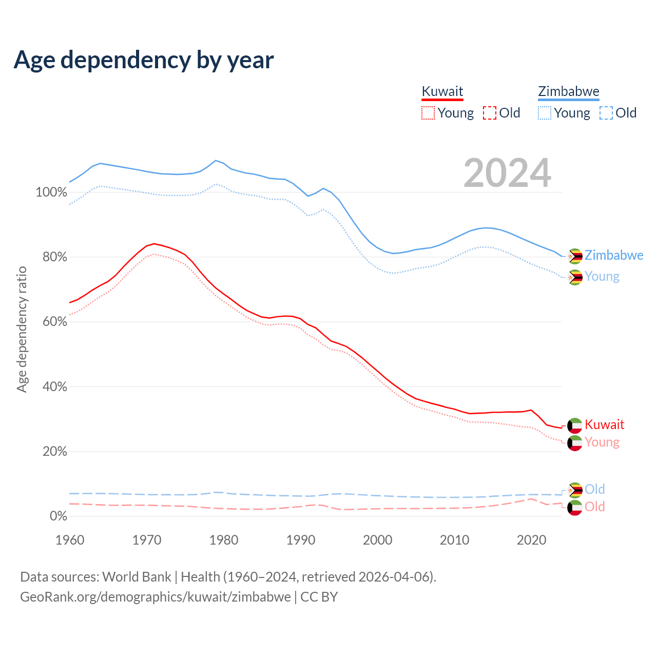 - Kuwait is ranked 71/196 by median age (oldest to youngest) vs 177/196 for Zimbabwe.