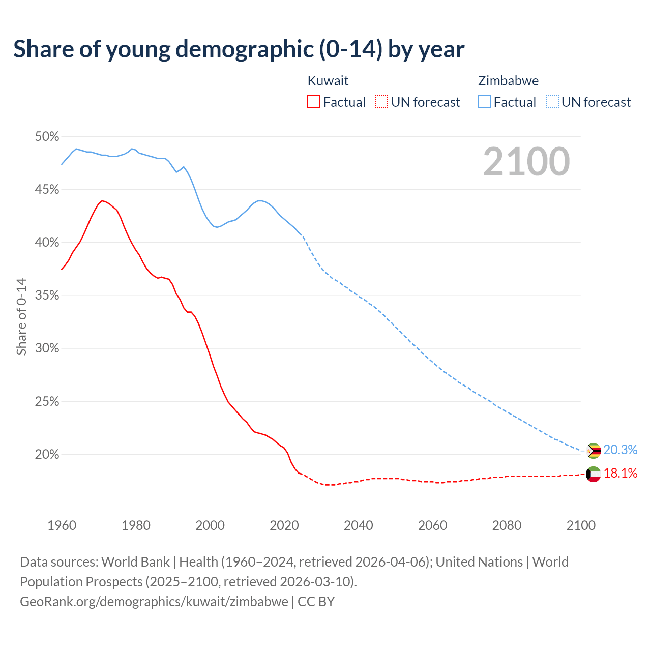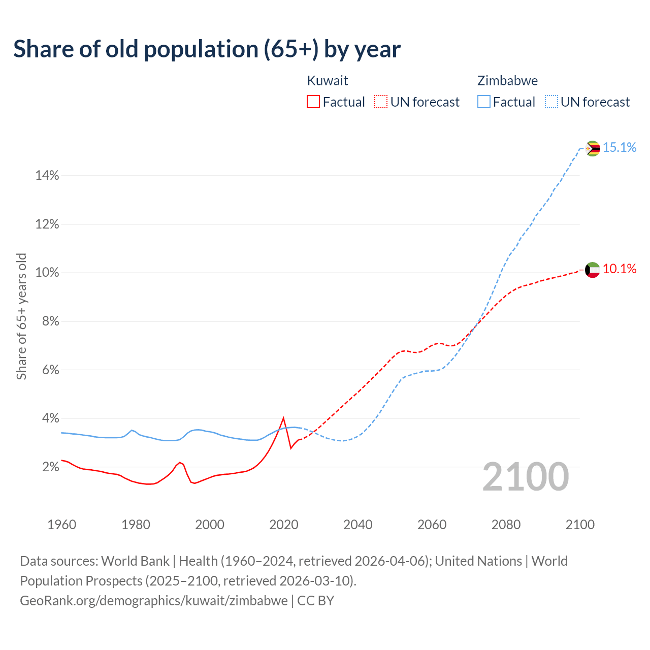 The share of older people aged 65 and over is 3.1% in Kuwait and 3.6% in Zimbabwe. Life expectancy in Kuwait compared to Zimbabwe .