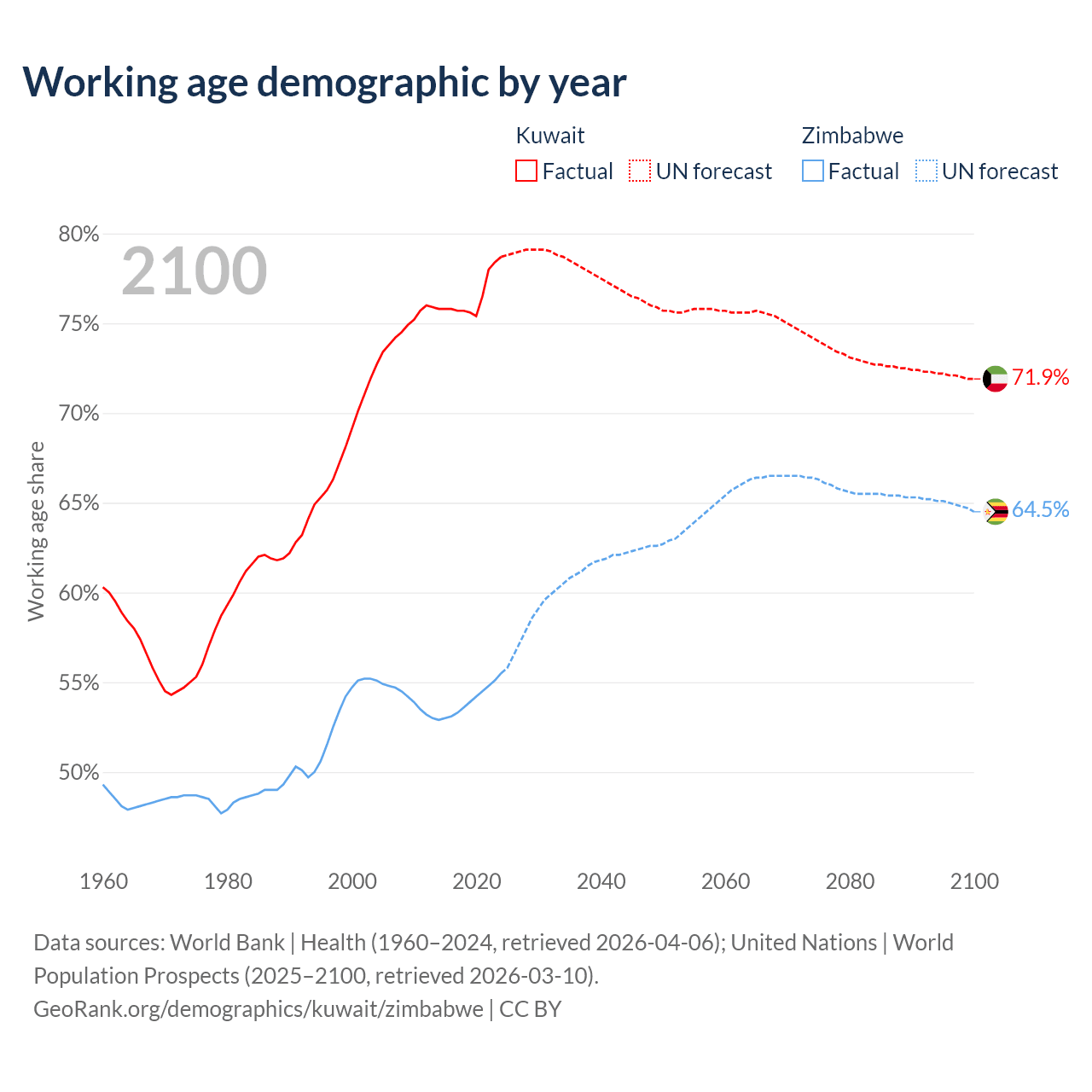 - Kuwait has 4.01M working age adults (aged 15-64) vs 9.64M in Zimbabwe.