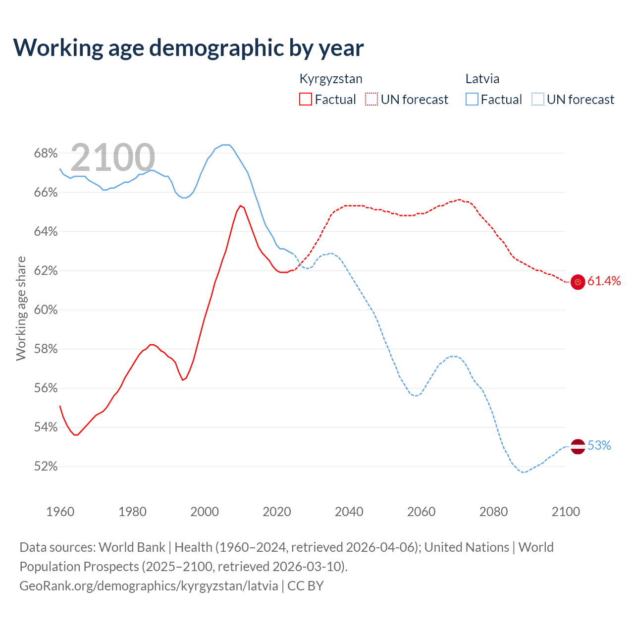 - The share of old-age demographic (65+) in Kyrgyzstan is 5.68% vs 21.7% in Latvia.