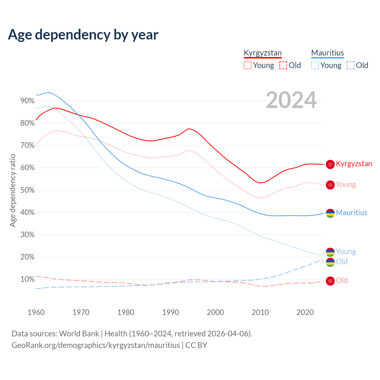 - The share of old-age demographic (65+) in Kyrgyzstan is 5.68% vs 13.5% in Mauritius.