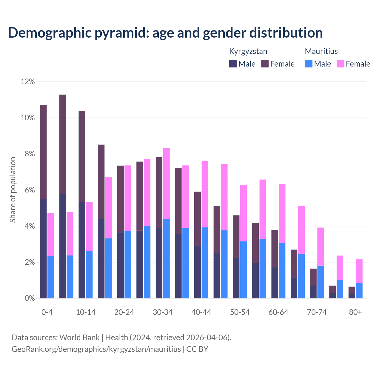 - Kyrgyzstan is ranked 126/196 by median age (oldest to youngest) vs 57/196 for Mauritius.
