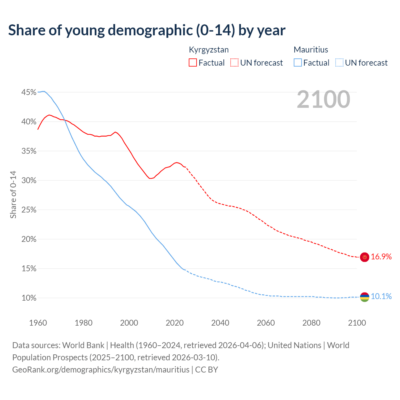 - The share of young demographic (0-15 years old) in Kyrgyzstan is 32.3% vs 14.8% in Mauritius.