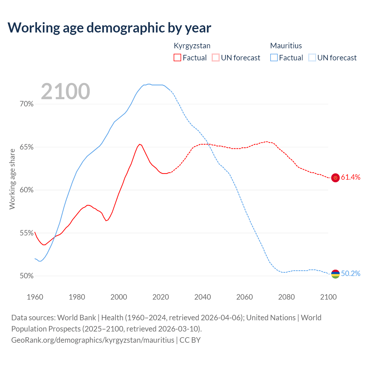 - Kyrgyzstan has 4.63M working age adults (aged 15-64) vs 889K in Mauritius.