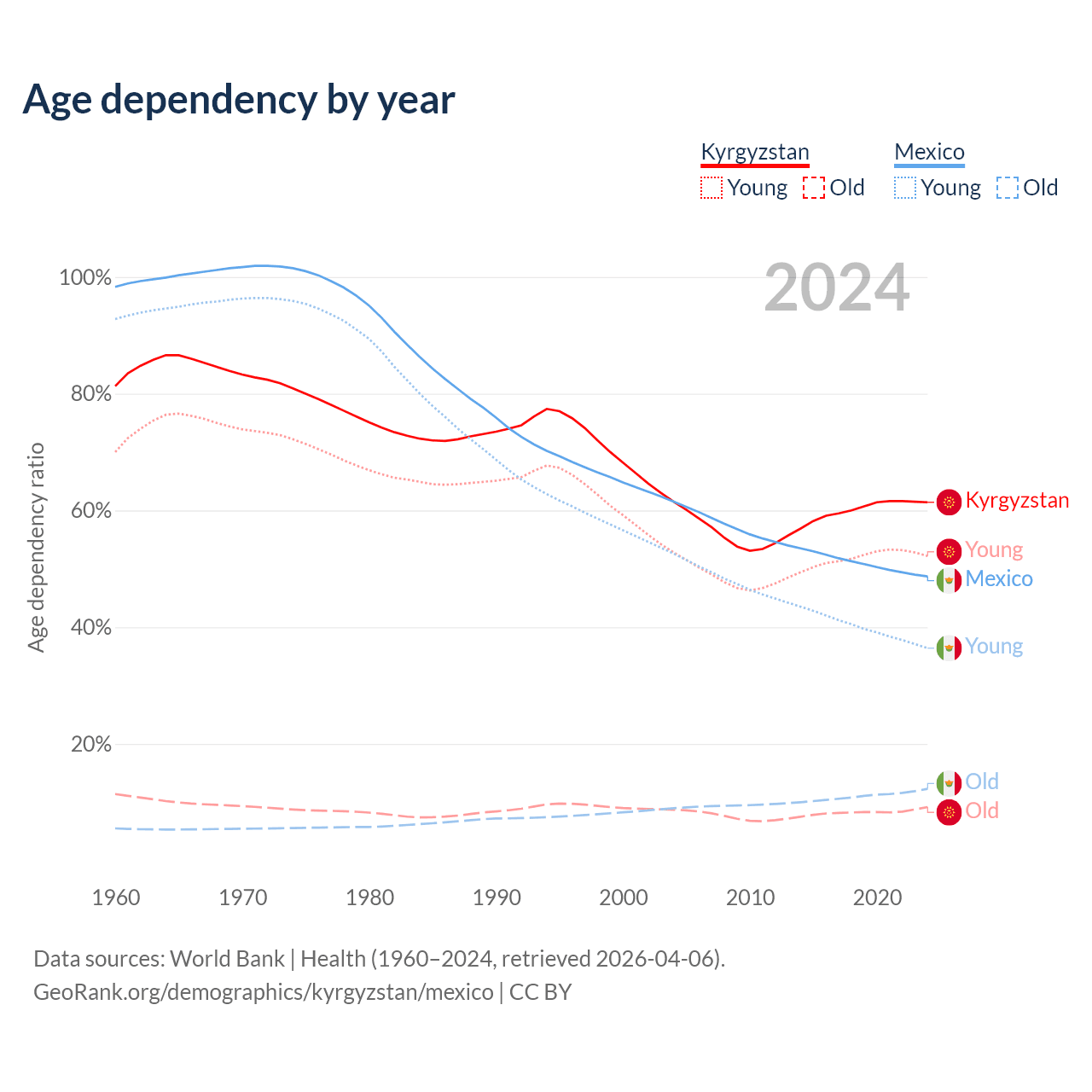 - The share of old-age demographic (65+) in Kyrgyzstan is 5.68% vs 8.25% in Mexico.