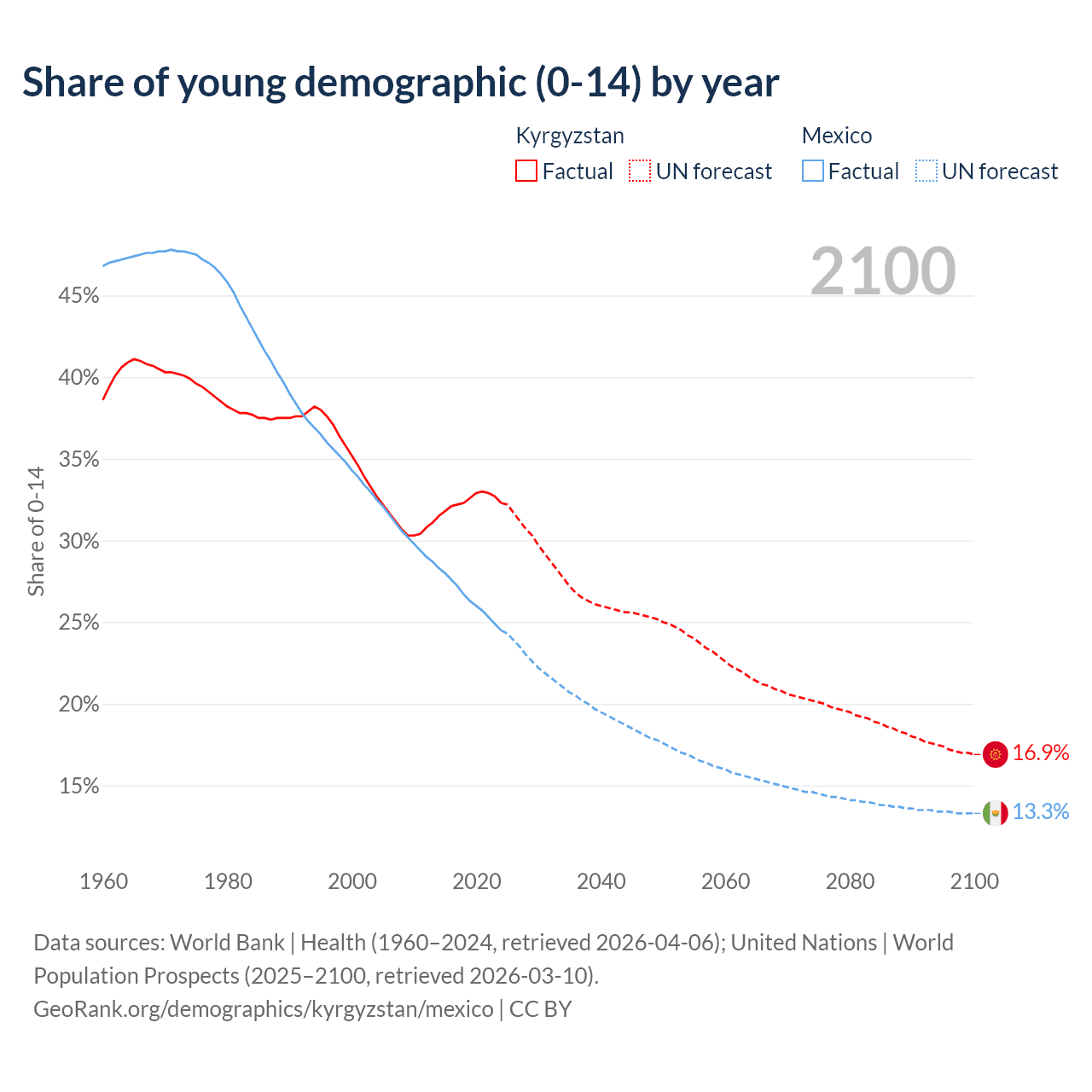 - The share of young demographic (0-15 years old) in Kyrgyzstan is 32.3% vs 24.5% in Mexico.