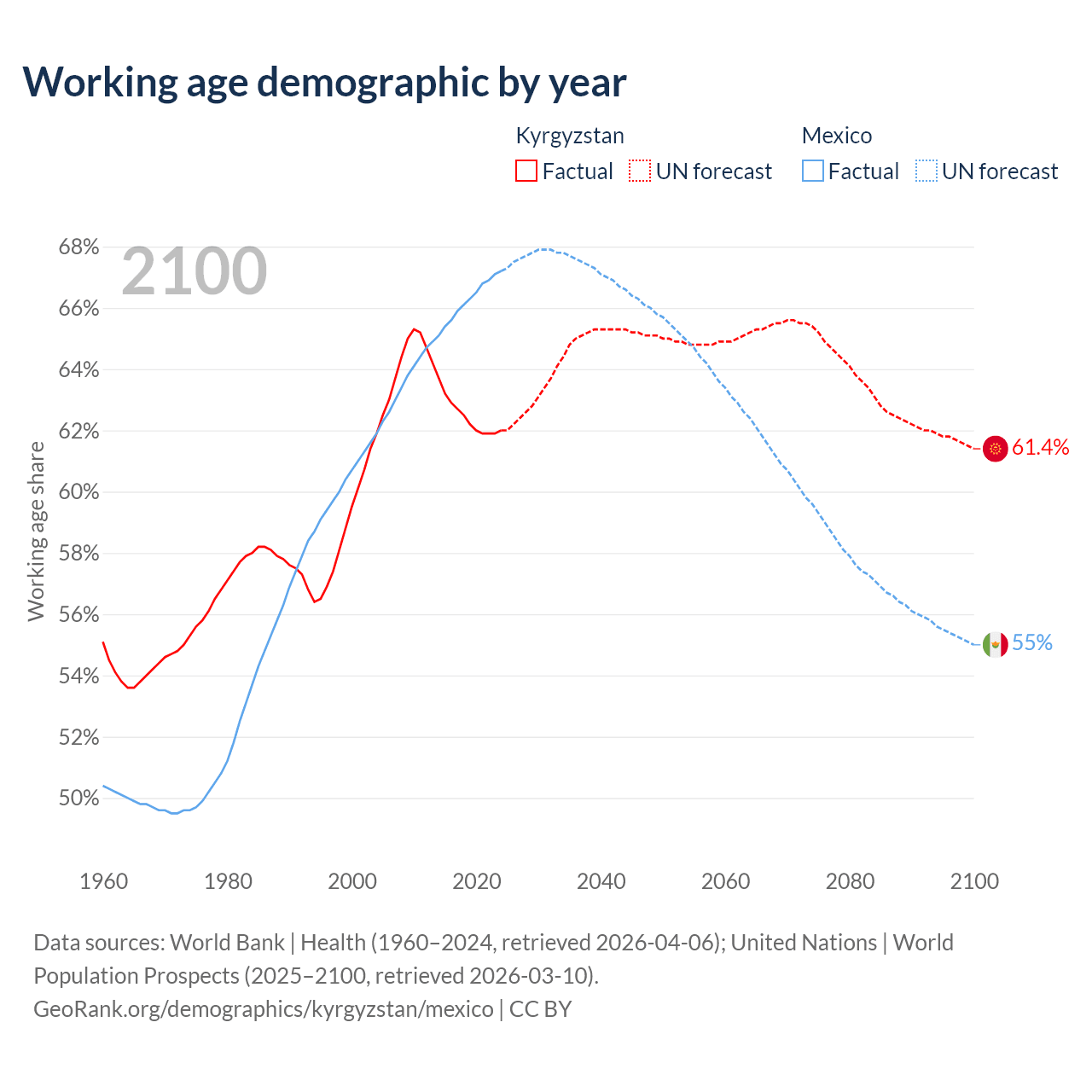 - Kyrgyzstan has 4.63M working age adults (aged 15-64) vs 89.6M in Mexico.