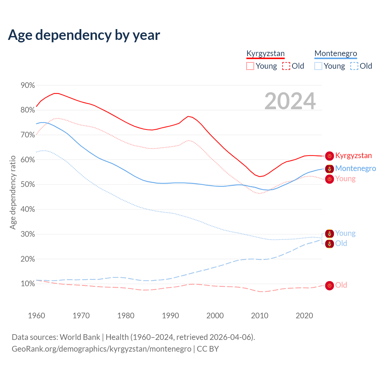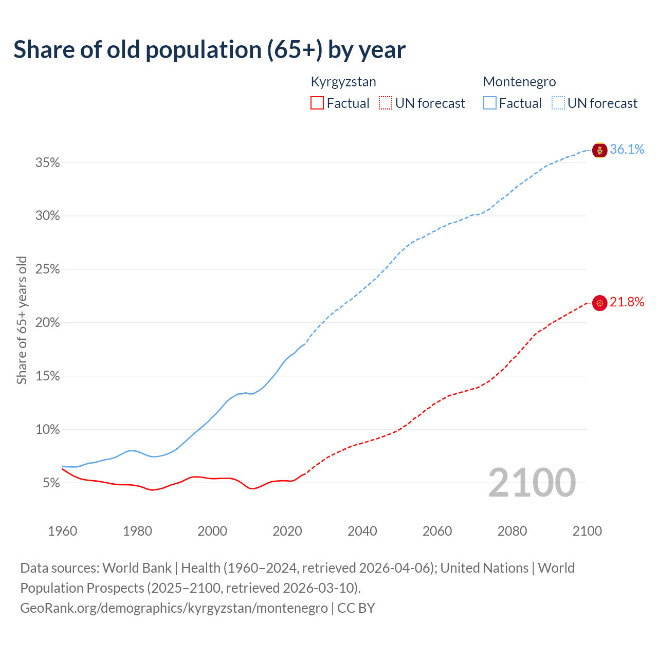 - The share of old-age demographic (65+) in Kyrgyzstan is 5.68% vs 17.8% in Montenegro.