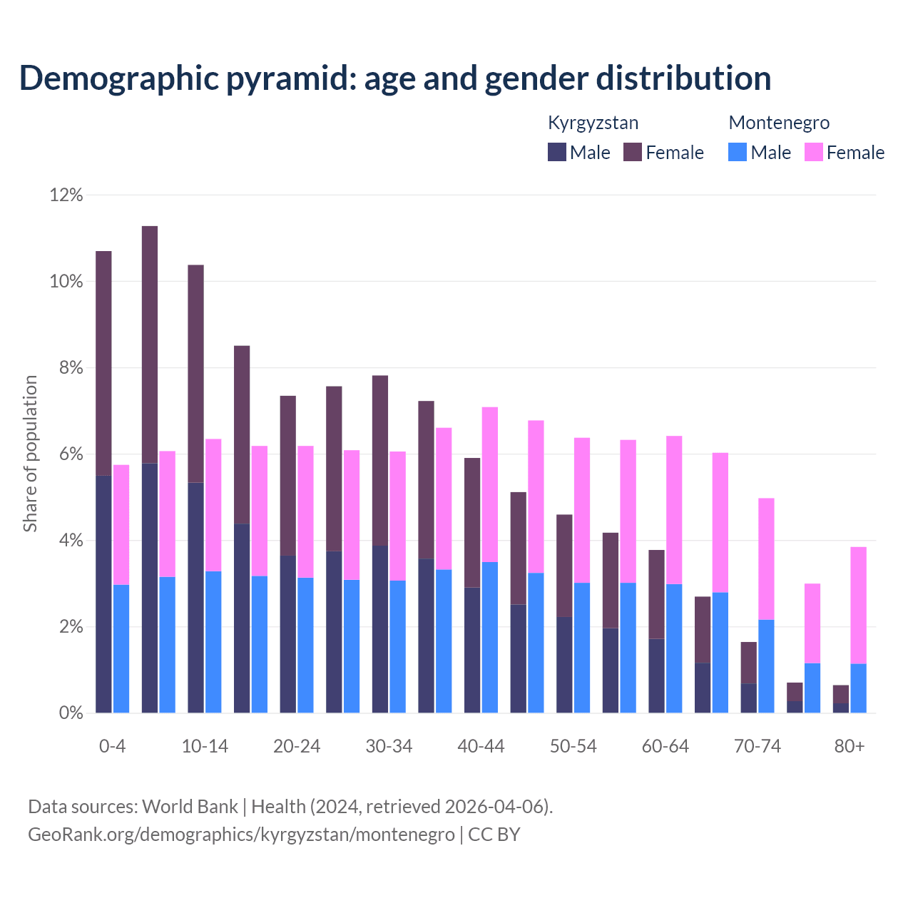 - The share of young demographic (0-15 years old) in Kyrgyzstan is 32.3% vs 18.1% in Montenegro.