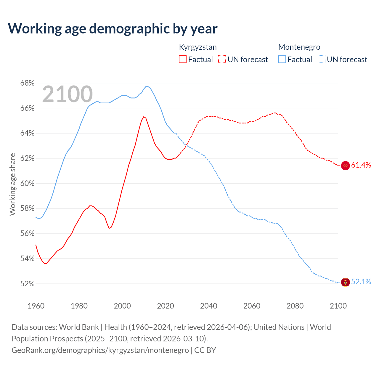 Median age Kyrgyzstan vs Montenegro, 1960-2100