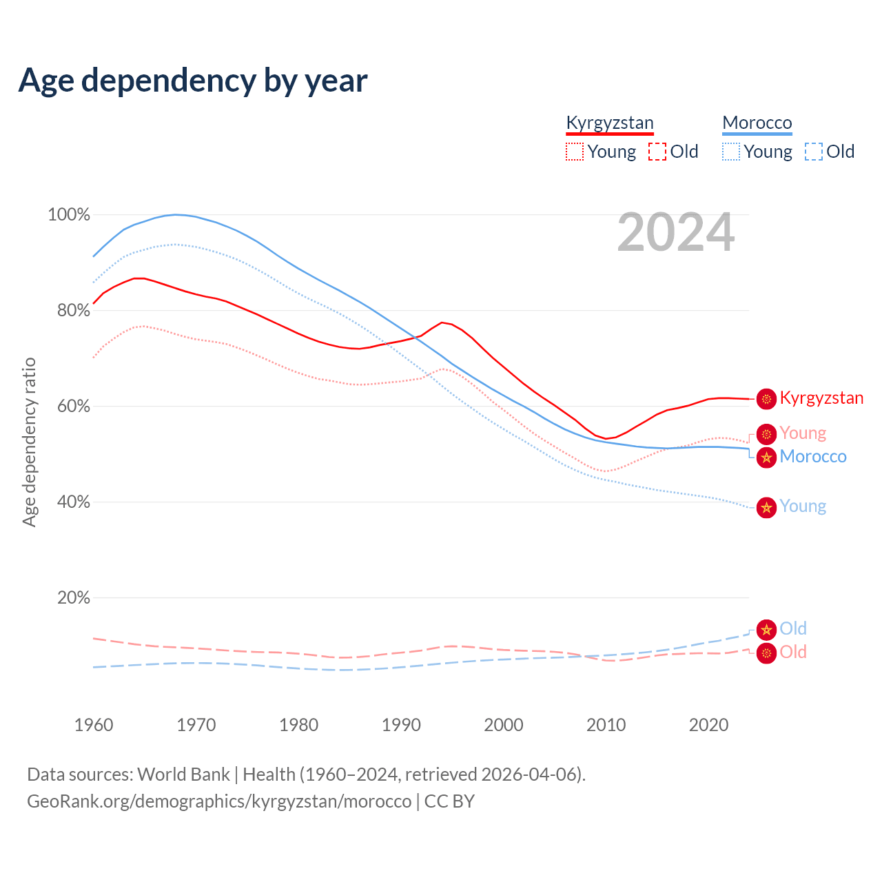 - Kyrgyzstan is ranked 126/196 by median age (oldest to youngest) vs 100/196 for Morocco.