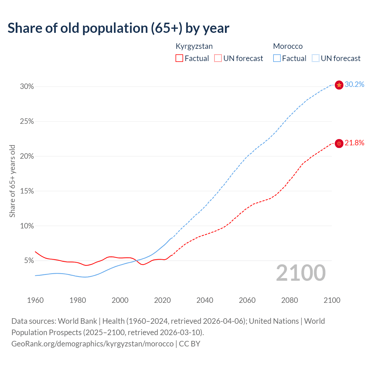 - The share of old-age demographic (65+) in Kyrgyzstan is 5.68% vs 8.14% in Morocco.