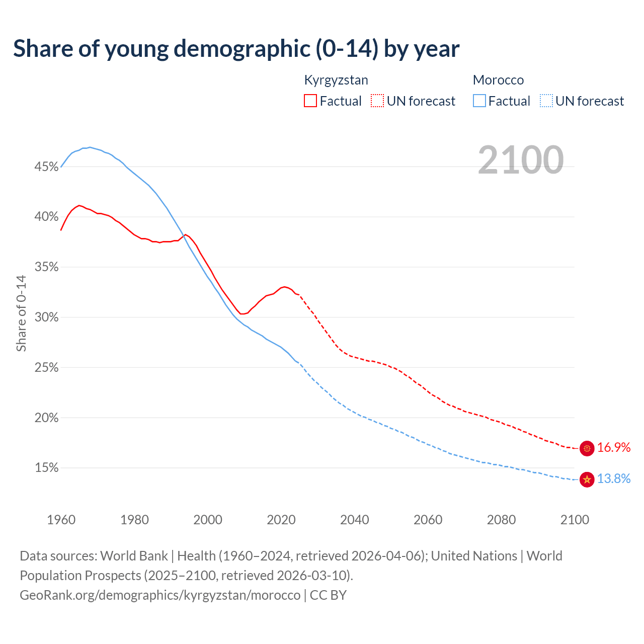 - The share of young demographic (0-15 years old) in Kyrgyzstan is 32.3% vs 25.6% in Morocco.