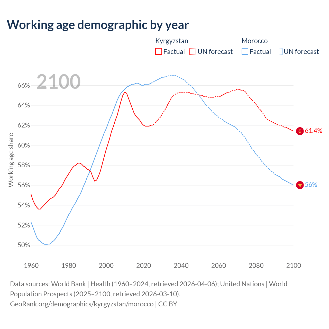 - Kyrgyzstan has 4.63M working age adults (aged 15-64) vs 25.7M in Morocco.