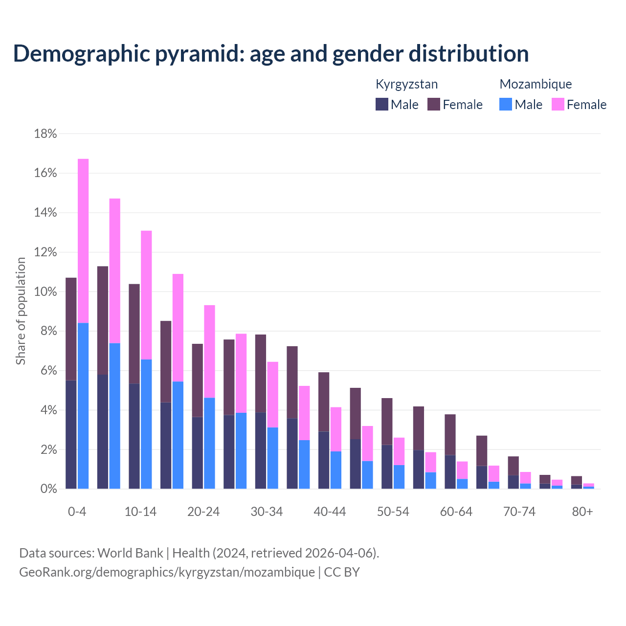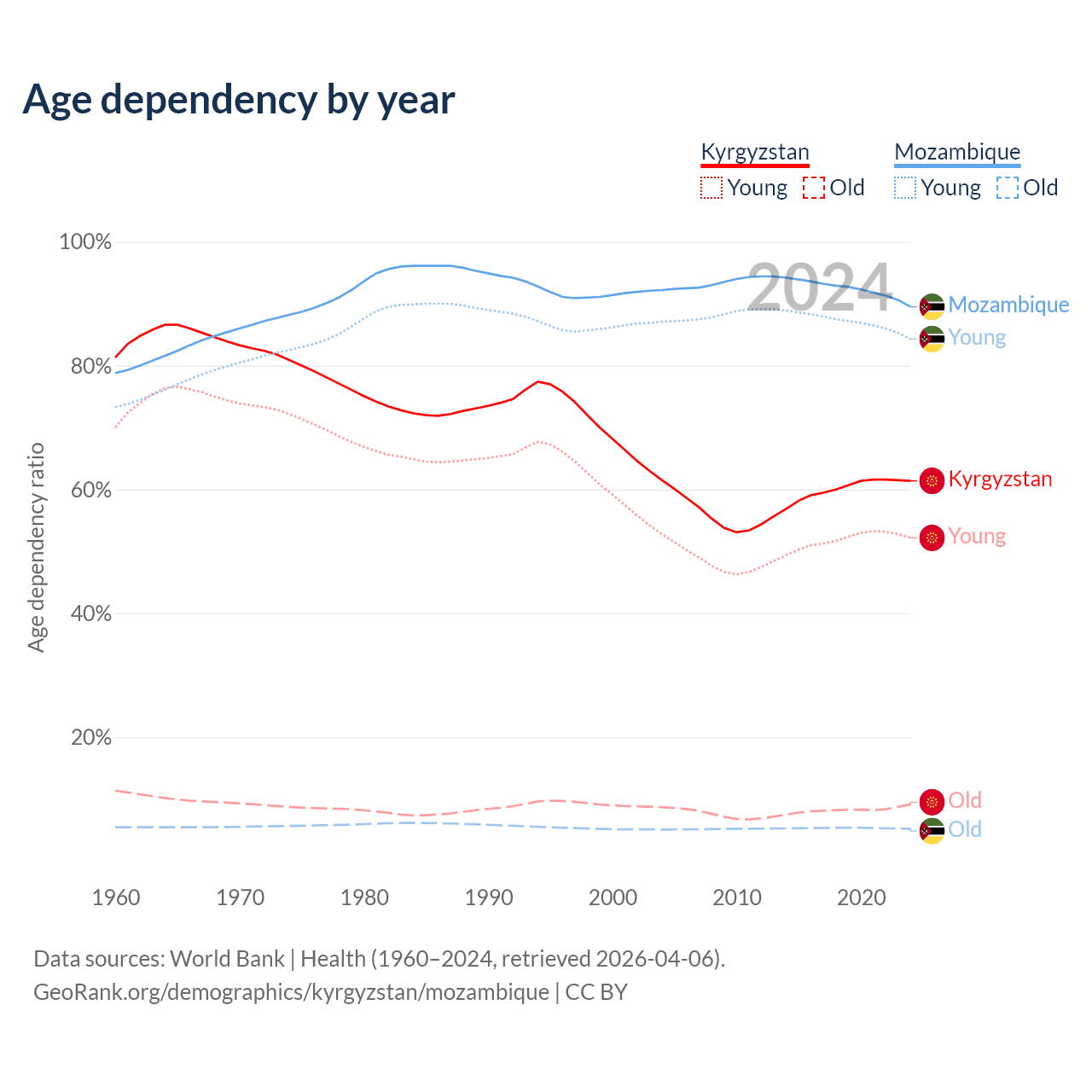 - The share of old-age demographic (65+) in Kyrgyzstan is 5.68% vs 2.75% in Mozambique.