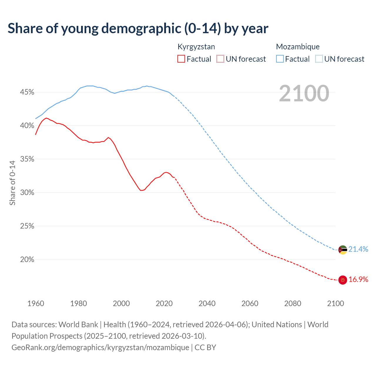 - The share of young demographic (0-15 years old) in Kyrgyzstan is 32.3% vs 44.5% in Mozambique.