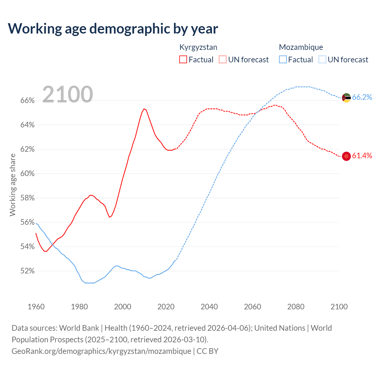 Median age Kyrgyzstan vs Mozambique, 1960-2100