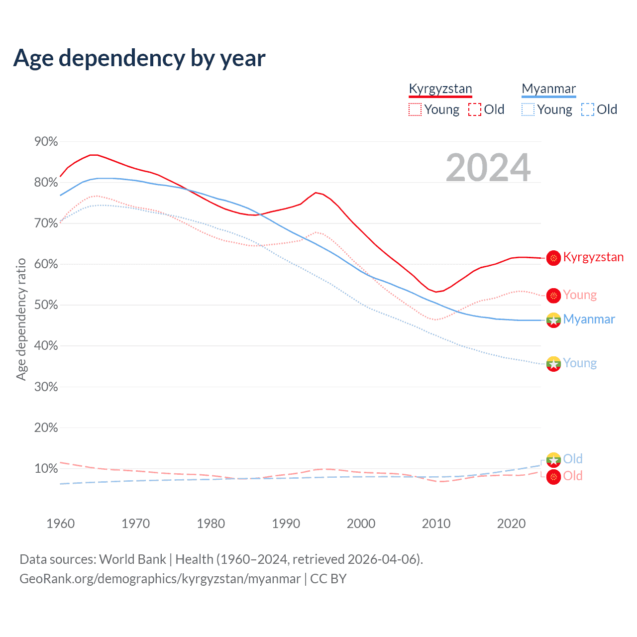 - Kyrgyzstan is ranked 126/196 by median age (oldest to youngest) vs 96/196 for Myanmar.