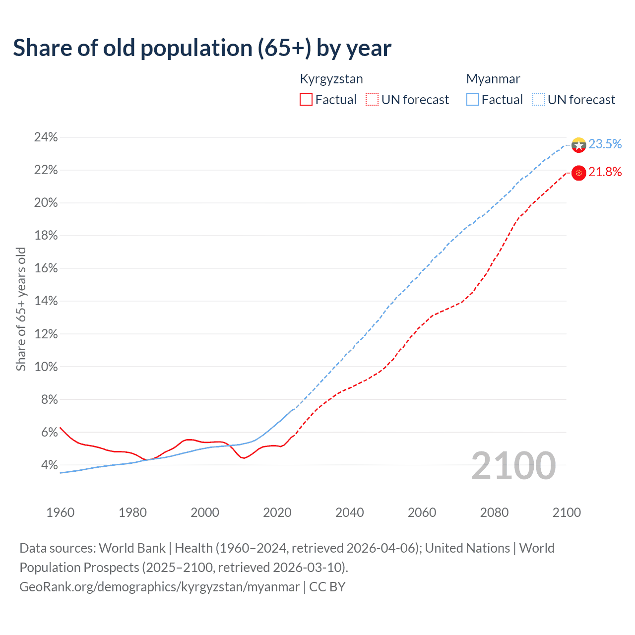 The share of older people aged 65 and over is 5.68% in Kyrgyzstan and 7.3% in Myanmar. Life expectancy in Kyrgyzstan compared to Myanmar .