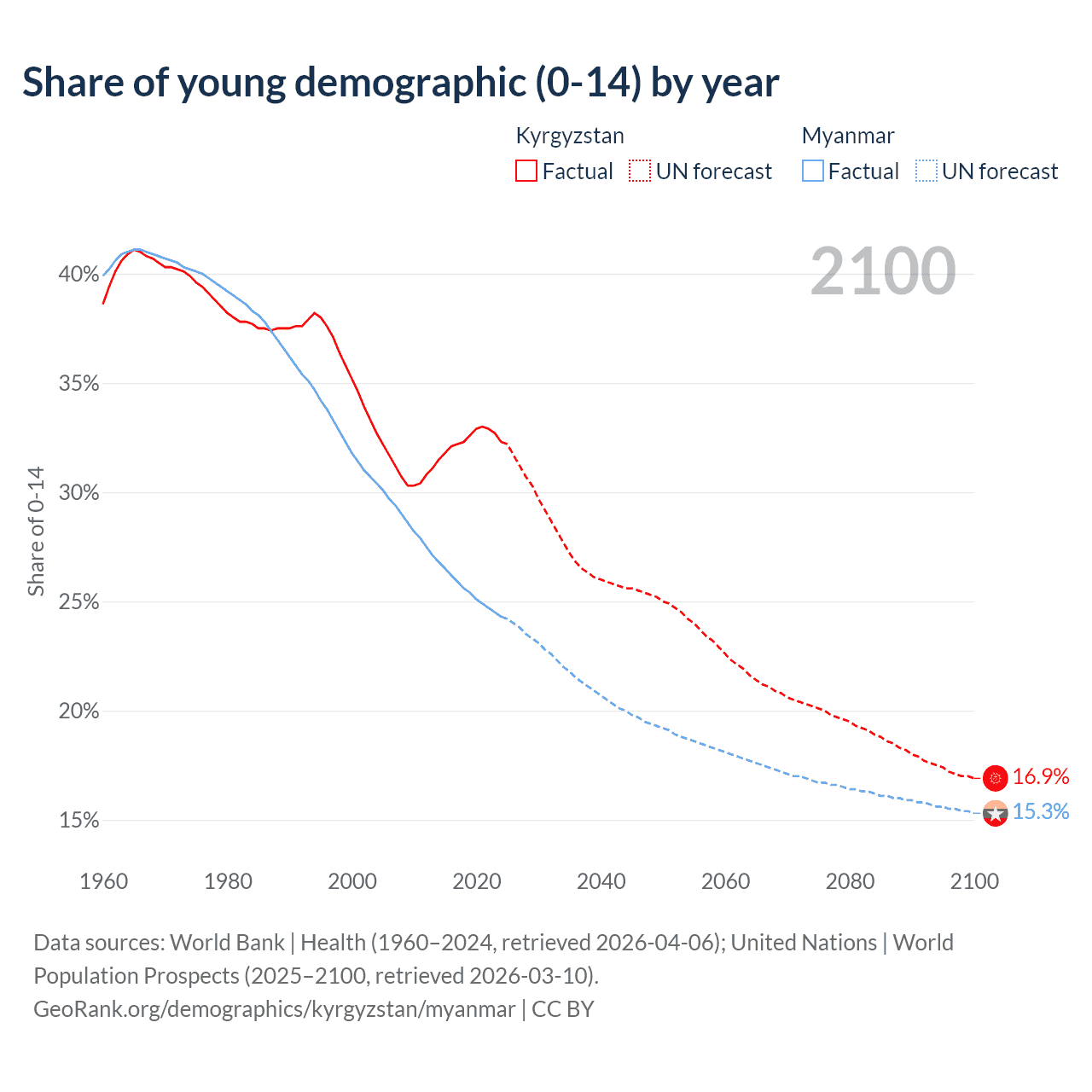 - The share of young demographic (0-15 years old) in Kyrgyzstan is 32.3% vs 24.3% in Myanmar.