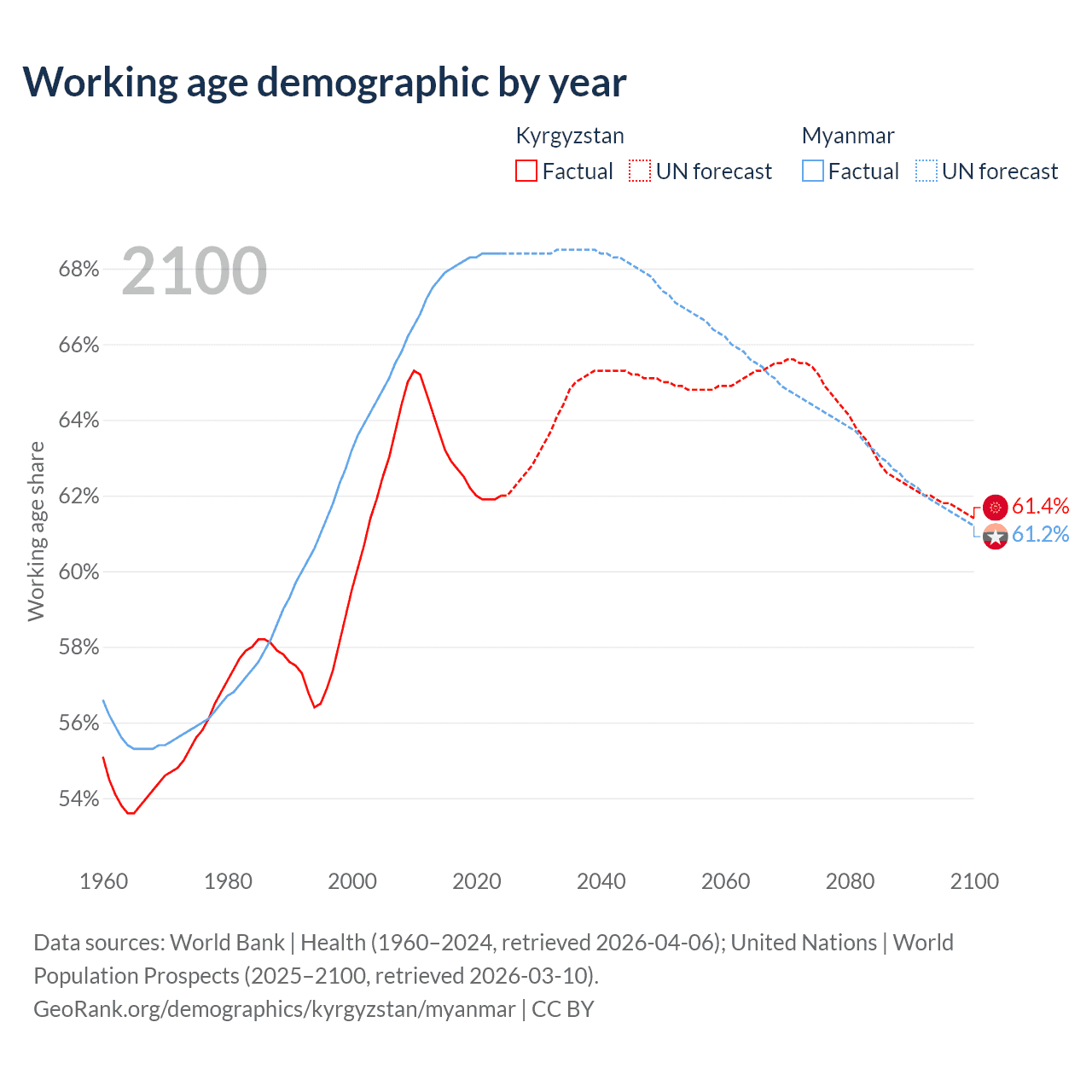 - Kyrgyzstan has 4.63M working age adults (aged 15-64) vs 37.8M in Myanmar.