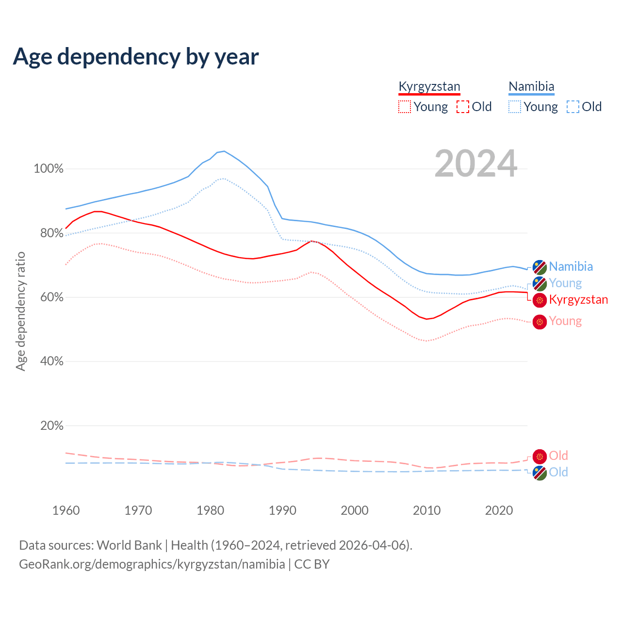 - The share of old-age demographic (65+) in Kyrgyzstan is 5.68% vs 3.67% in Namibia.