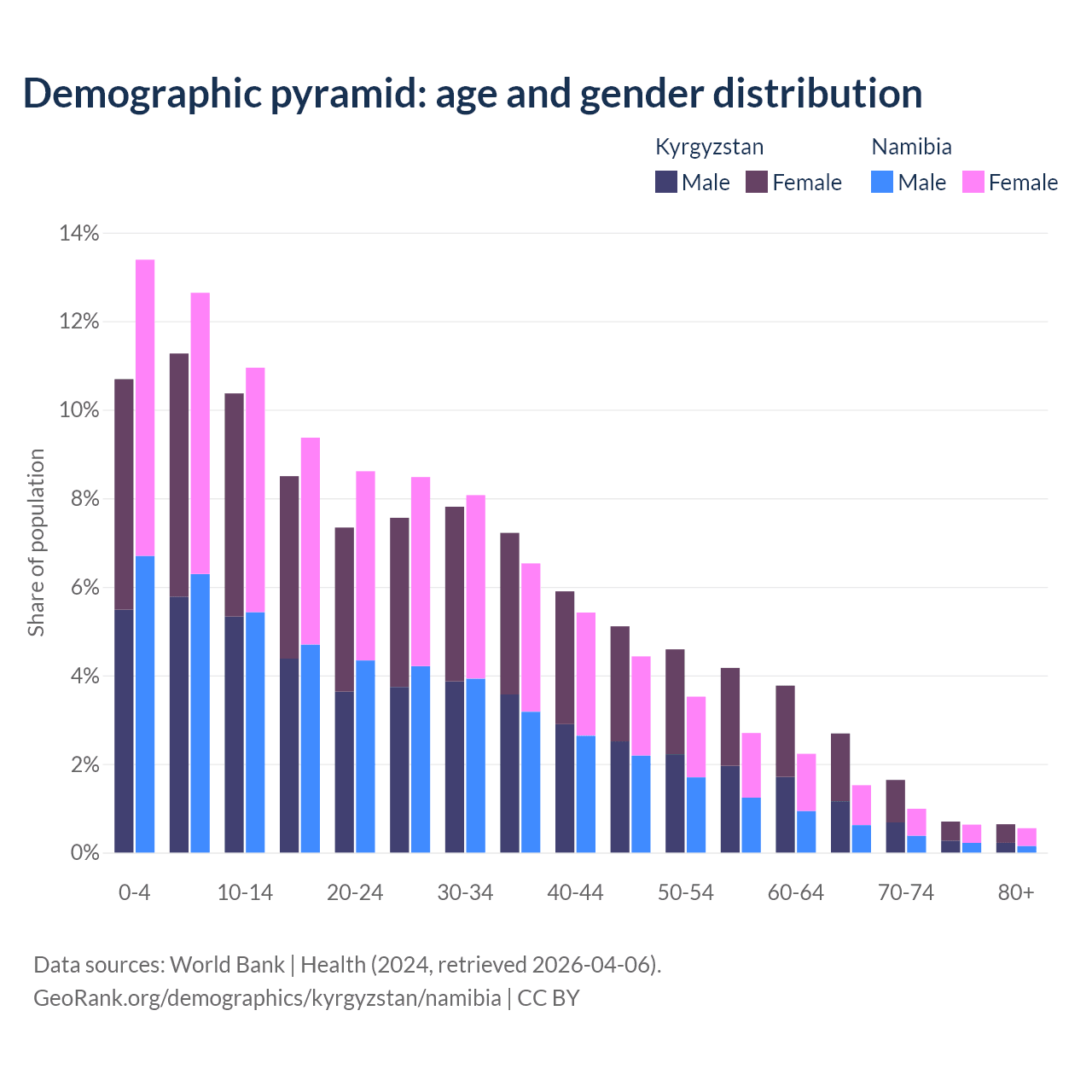 - Kyrgyzstan is ranked 126/196 by median age (oldest to youngest) vs 147/196 for Namibia.