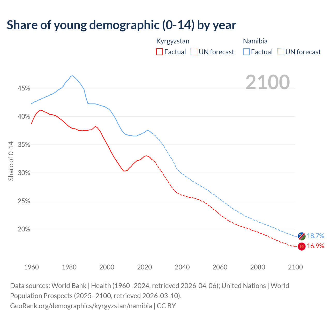 - The share of young demographic (0-15 years old) in Kyrgyzstan is 32.3% vs 37% in Namibia.