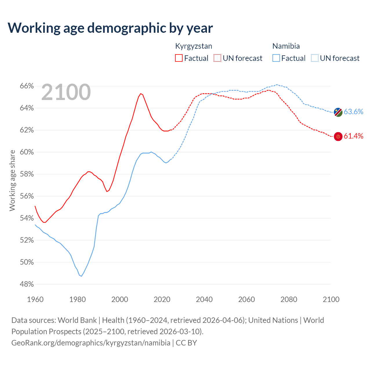 - Kyrgyzstan has 4.63M working age adults (aged 15-64) vs 1.88M in Namibia.